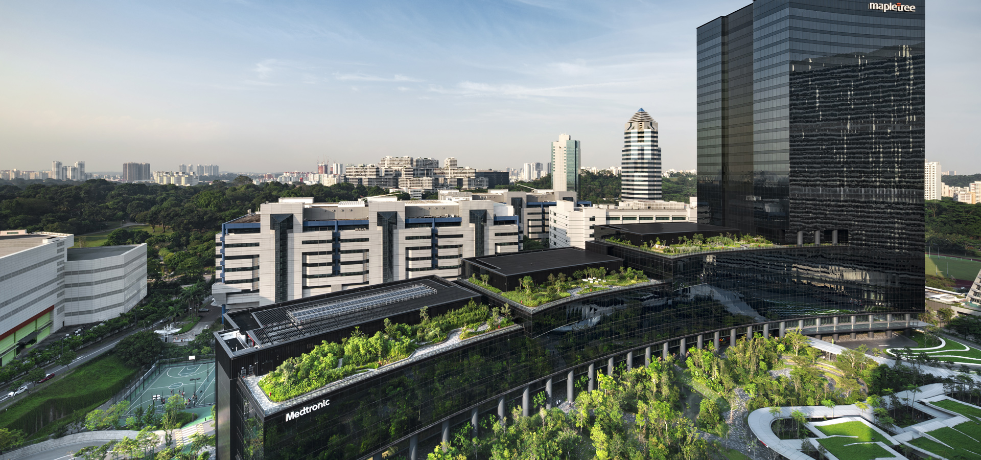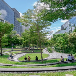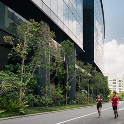 Mapletree Business City II is located in the western territory of Singapore Island once designated to be industrial estate zone with ports and warehouses. Despite close proximity to the Kent Ridge Park, a nature reserve, past developments in the area did not pay close attention to preserving the nature. With high level of urban density and competitions of establishments that multiply like concrete mushrooms, the question arise on where will the green areas be?