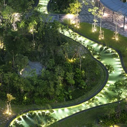 On spatial design, the design encourages office workers to step out and perform typical office activities in the natural surroundings, whether to have lunch, co-working, organize meetings or workshops to promote creativity and a healthy lifestyle. Both outdoor sitting spaces along the pathway or more secluded setting on top of the mounds are created to promote interaction amongst not only with each other, but also with nature as well. Green amphitheater is proposed at one corner to cater for large group gatherings during special events or performances and can also be treated as quiet sitting space during regular days. Recreational programs such as full functional sport facilities ranging from a futsal court, a basketball court, an outdoor fitness station and a jogging route, which connects out to the Kent Ridge Park and government’s project of Rail Corridor, allow a connectivity between private and public users to strengthen the urban up-flow. After sunset, landscape lighting illuminates the forest at night to cater for those who use recreation facility after hours.