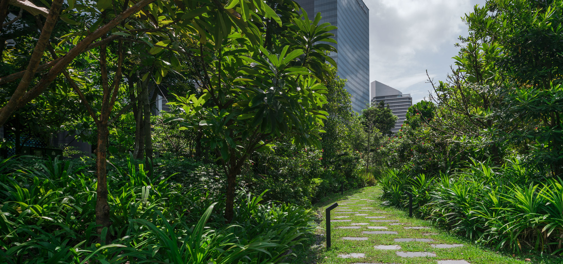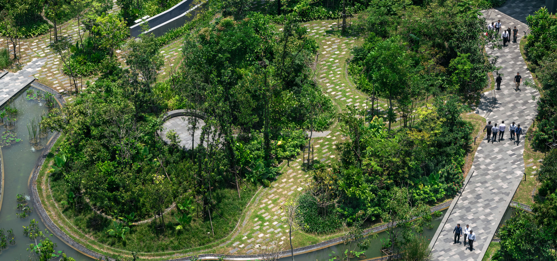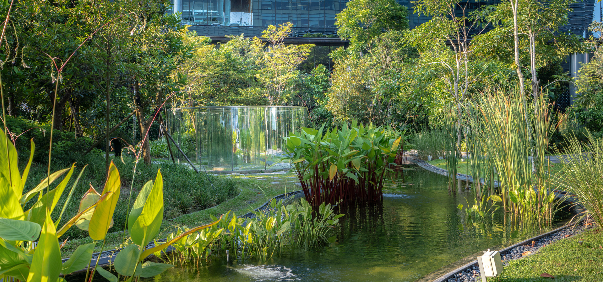 In order to create a forest habitat, over 65 indigenous species of trees, shrubs, ground cover, and water plants mostly found at nearby Nature Reserved were specified.