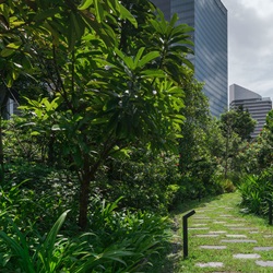 Mapletree Business City II, located in the western territory of Singapore Island designated to be an industrial zone with port and warehouses. Despite close proximity to Kent Ridge Park, the landscape design concept which draws inspiration from the adjacent nature reserve to create an ‘Urban Wilderness’ will not only provide an ideal comfortable environment for various co-working spaces and recreational facilities amidst tropical climate but also enhance the ecology at large. In an attempt to connect the ecological corridor from the nearby Kent Ridge Park Nature Reserves, a ‘Forest Ecosystem’ is created largely on top of car park podium acting as a welcoming space and a point of interchange between phase 1& 2 and on most of the sky roofs of the stacking tower with average soil depth at 1.8 meter to ensure forest future growth.