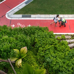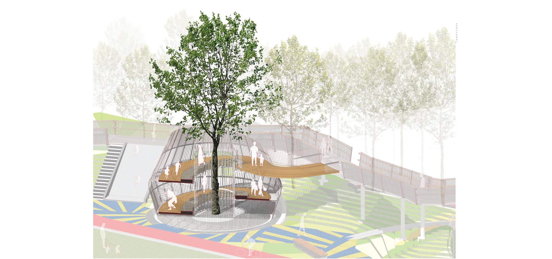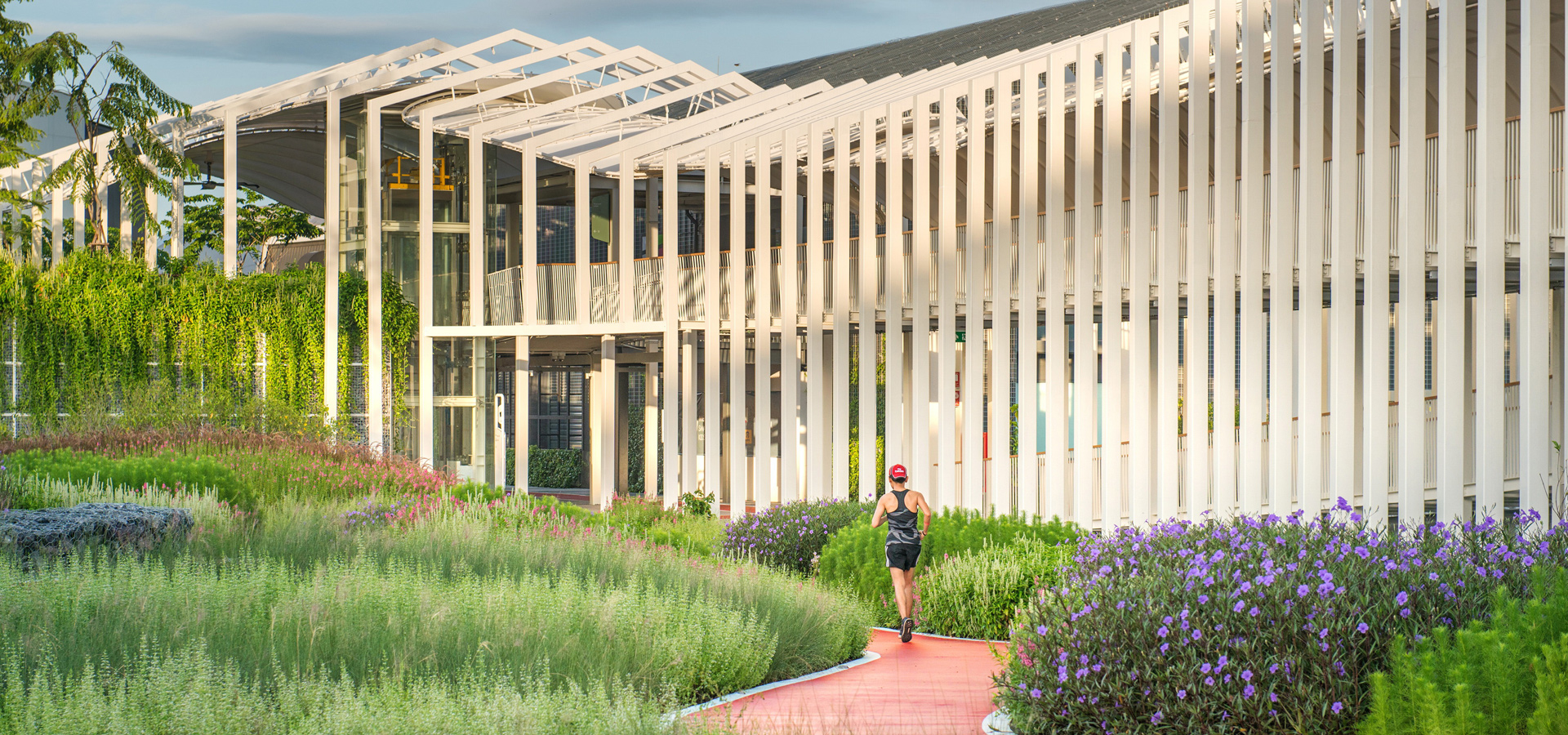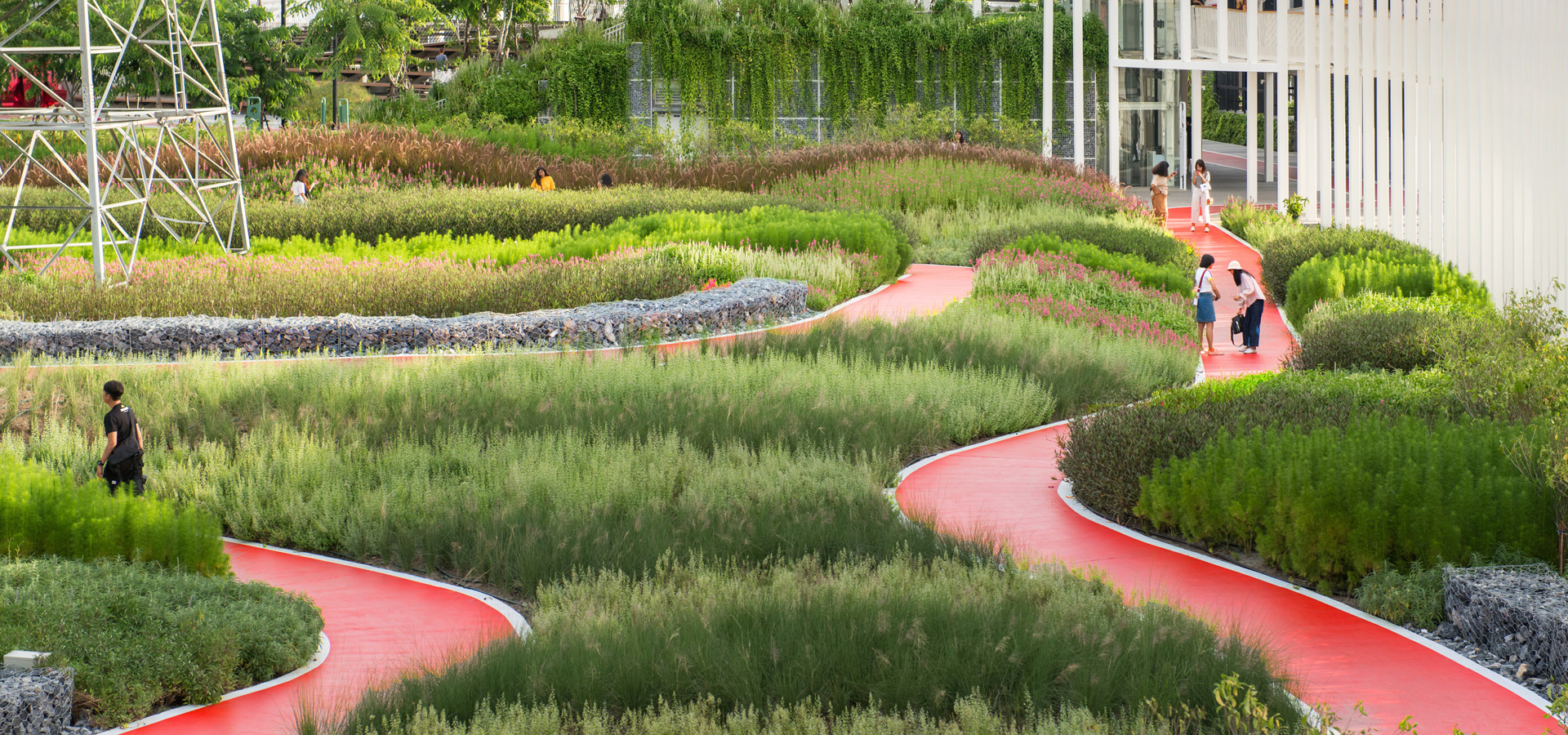 พื้นที่แห่งนี้ไม่ได้ถูกออกแบบเพื่อสร้างพื้นที่กิจกรรมให้ผู้คนเท่านั้น แต่ยังมีการคำนึงถึงการเสริมสร้างสภาพแวดล้อมที่ดีและยั่งยืนควบคู่กันไปด้วย ต้นตะเคียนซึ่งเป็นไม้พื้นถิ่นถูกใช้เป็นต้นไม้หลักที่ช่วยเพิ่มบรรยากาศในการเดินชมยอดไม้ได้เป็นอย่างดี โดยการผสมผสานไม้พุ่มทรอปิคอลตลอดแนวทางเดินรอบสวนสาธารณะช่วยสร้างเสริมประสบการณ์การเรียนรู้ไม้พื้นถิ่นที่พบเจอได้ยากในเขตเมืองให้กับเด็กๆ ได้อย่างน่าสนใจ นอกจากนี้ทุ่งดอกไม้ที่มีการใช้พืชพันธุ์ประเภทไม้ล้มลุกซึ่งปลูกเป็นแถบยาวสลับชนิดพันธุ์กันไปทุก 3 เมตร ได้กลายเป็นแหล่งอาหารและที่อยู่อาศัยชั้นดีสำหรับแมลงหลากหลายสายพันธุ์ อาทิ ผึ้ง และผีเสื้อนานาชนิดการออกแบบสวนสาธารณะแห่งนี้มุ่งเน้นในการสร้างพื้นที่ที่ครอบครัวจะได้ใช้เวลาร่วมกันอย่างมีความสุขภายใต้สภาพแวดล้อมที่ปลอดภัย และสร้างเสริมประสบการณ์ที่ดีให้กับทุกกลุ่มคน โดยสะท้อนผ่านการวางผัง การออกแบบพื้นที่กิจกรรม และการเลือกใช้พืชพรรณที่เหมาะสม เพื่อตอบสนองต่อความต้องการของกลุ่มผู้ใช้งานอย่างแท้จริง
