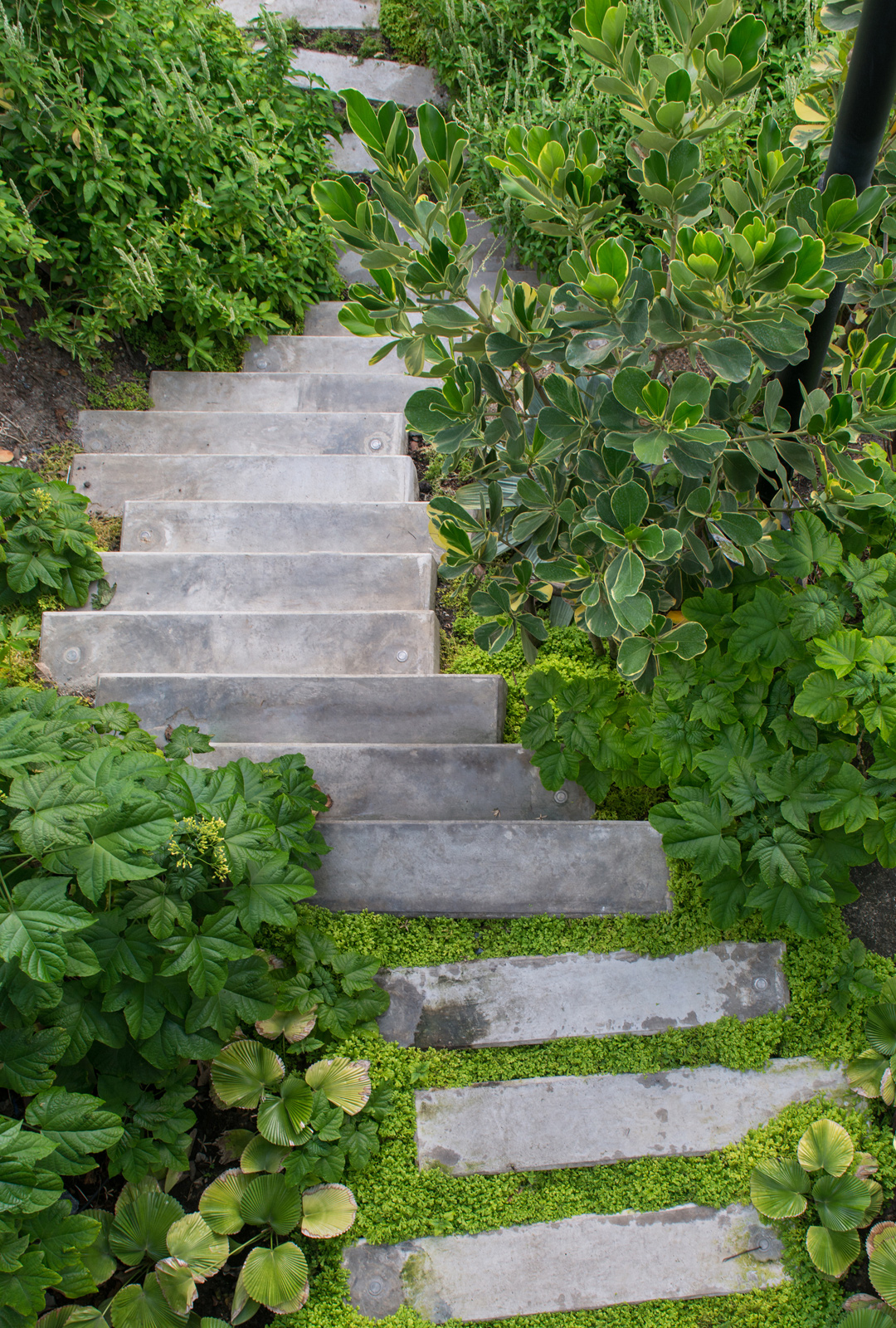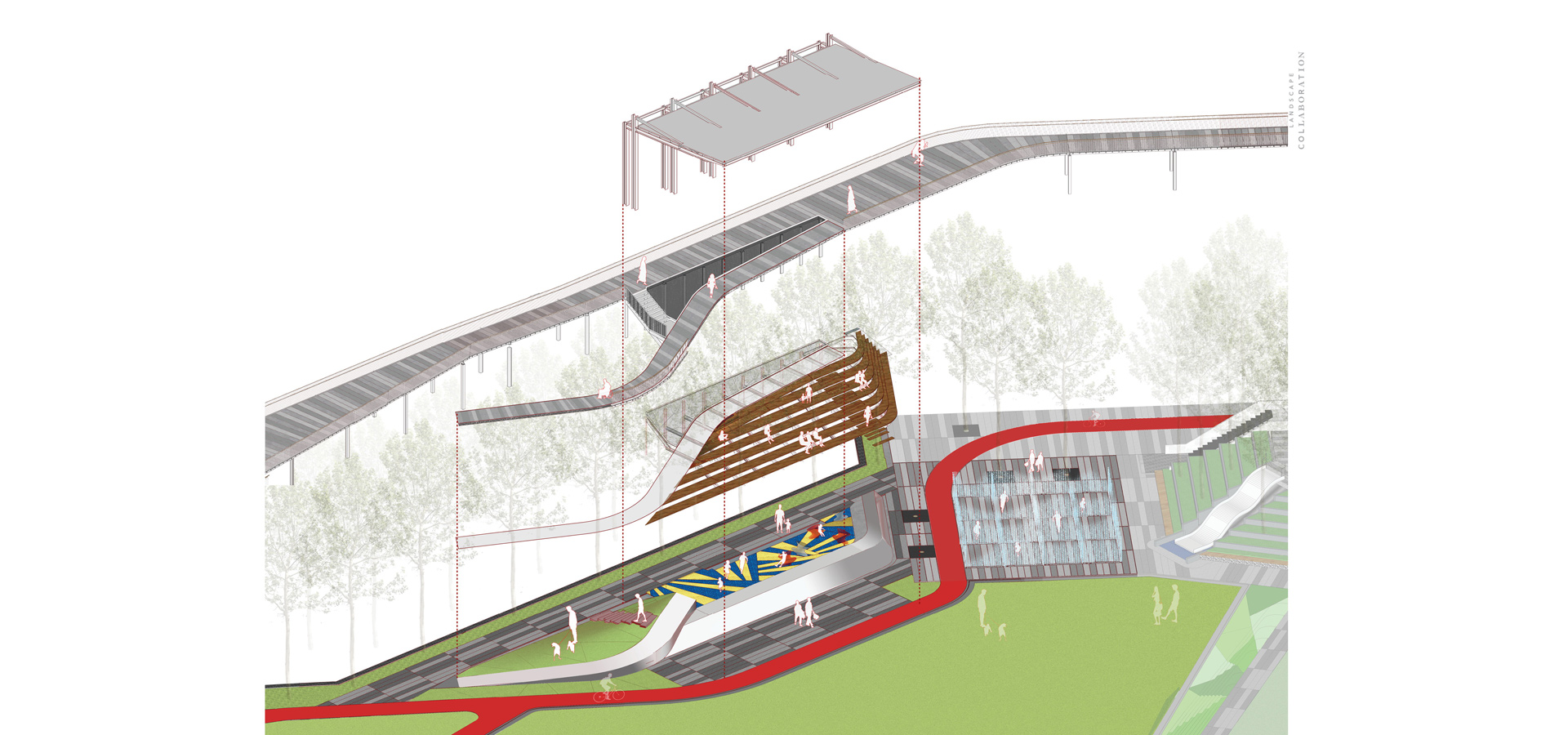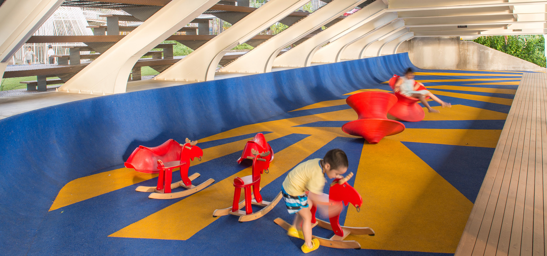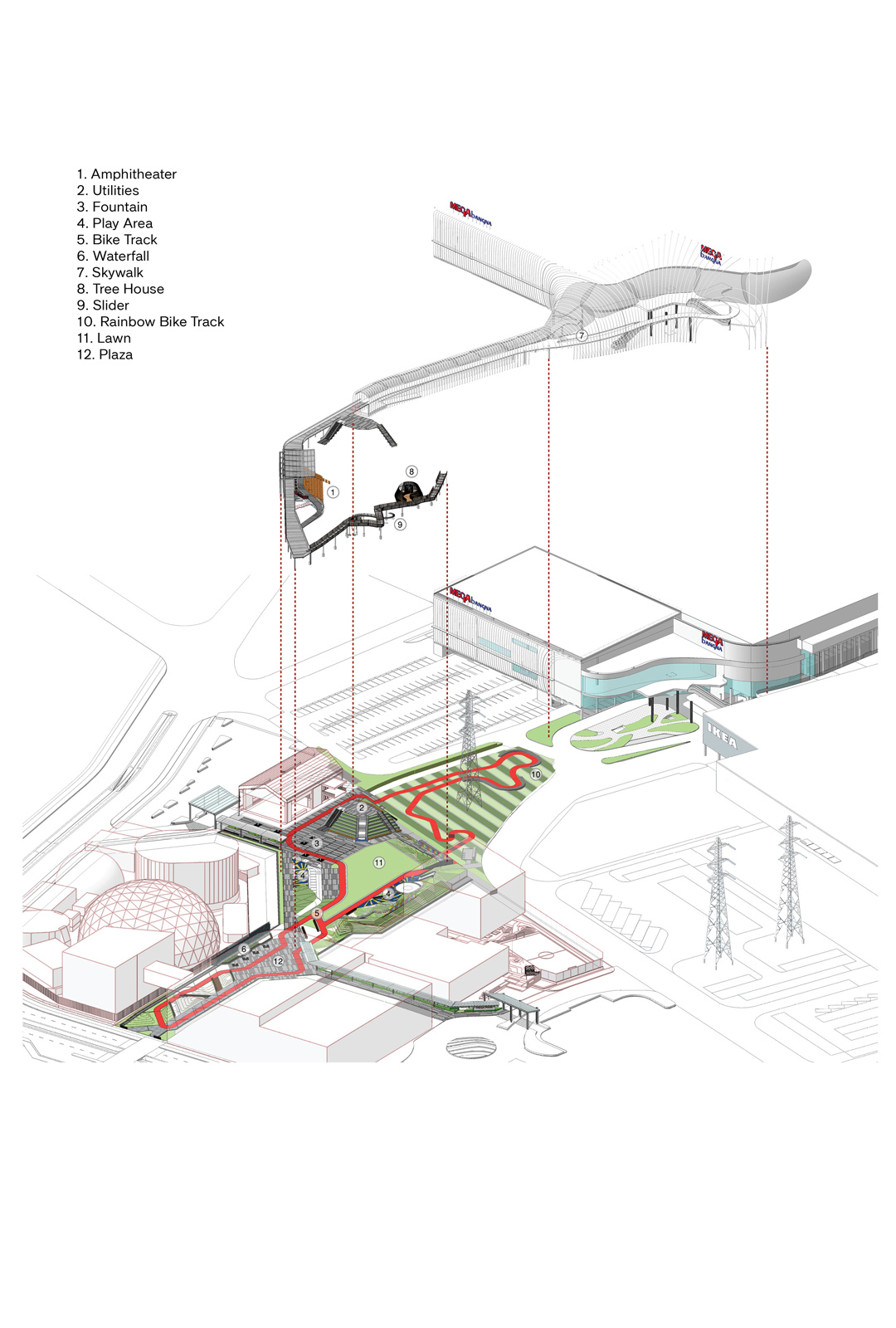 สวนสาธารณะแห่งนี้มีเส้นทางเดินหลัก 2 เส้นทาง เริ่มต้นจากทางเดินยกลอยที่ต่อเนื่องเป็นส่วนหนึ่งของสะพานเหล็กสีขาวขนาดใหญ่ซึ่งเชื่อมออกมาจากภายในศูนย์การค้าโดยตรง ทางเดินยกลอยนี้ถูกออกแบบให้สัญจรผ่านพื้นที่กิจกรรมมากมาย อาทิ อัฒจรรย์ (Amphitheater) ทางเดินชมยอดไม้ (Top tree walk) และบ้านต้นไม้ (Tree house) โดยทุกพื้นที่ล้วนสามารถเข้าถึงได้ด้วยทางเดินลาดยาวที่เหมาะสมแก่การใช้งานของทุกกลุ่มคน (Universal Design) ซึ่งทางเดินยกลอยนี้ไม่ได้ถูกออกแบบมาเพียงเพื่อเปิดประสบการณ์และมุมมองใหม่ๆ แก่ผู้ใช้งานเท่านั้น แต่ยังทำหน้าที่เป็นหลังคาให้กับทางเดินเท้าด้านล่างได้เป็นอย่างดี โดยทางเดินในระดับพื้นดินที่ผู้คนสามารถเพลิดเพลินไปทั่วพื้นที่ได้อย่างอิสระ จะมีเส้นทางจักรยานสีแดงเป็นลวดลายทาบทับบนพื้นเพื่อแทรกกิจกรรมการวิ่งจ็อกกิง หรือการปั่นจักรยานที่ลัดเลาะไปยังทุ่งดอกไม้ ลานพลาซ่า และสนามหญ้าโล่งกว้าง ซึ่งต่อเนื่องไปกับพื้นที่กิจกรรมสำหรับเด็ก ทั้งลานน้ำพุวงกต (Water Maze) บ้านต้นไม้ (Tree House) สนามเด็กเล่นใต้อัฒจรรย์ และสไลเดอร์ ล้วนถูกจัดวางให้อยู่ในตำแหน่งที่เด็กๆ วิ่งเล่นถึงกันได้โดยง่ายและเป็นสัดส่วน อีกทั้งครอบครัวสามารถร่วมเล่นสนุกหรือสอดส่องดูแลจากอัฒจรรย์ได้อย่างสะดวกสบาย