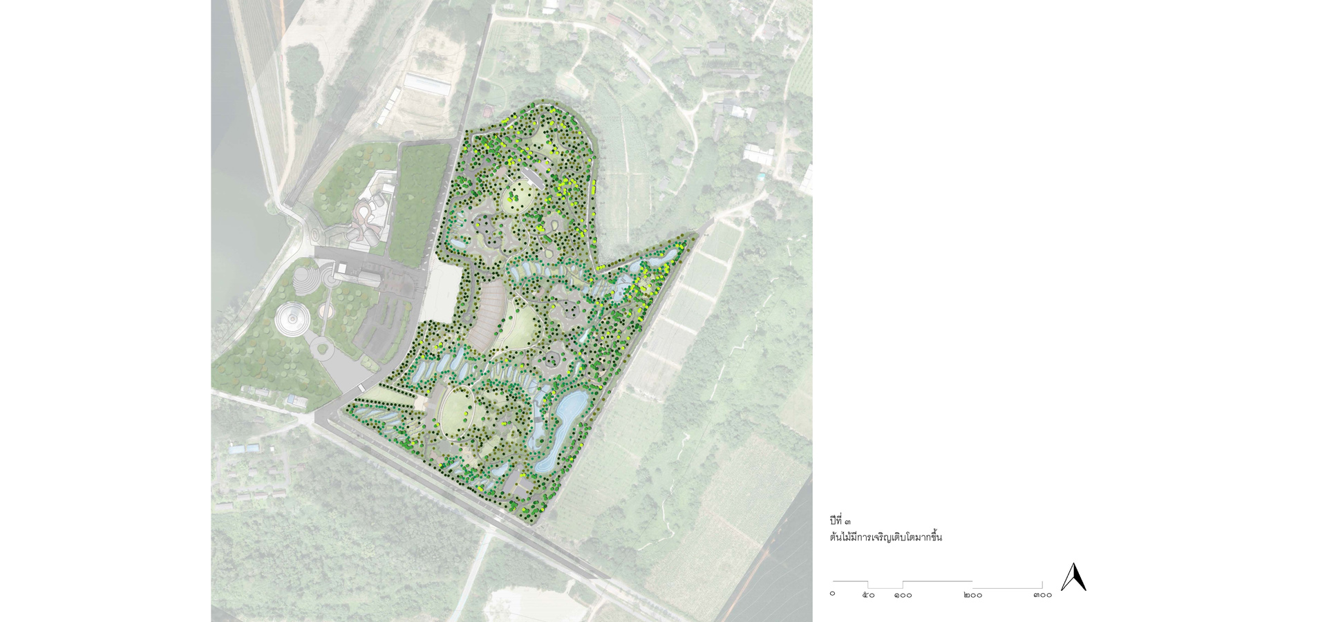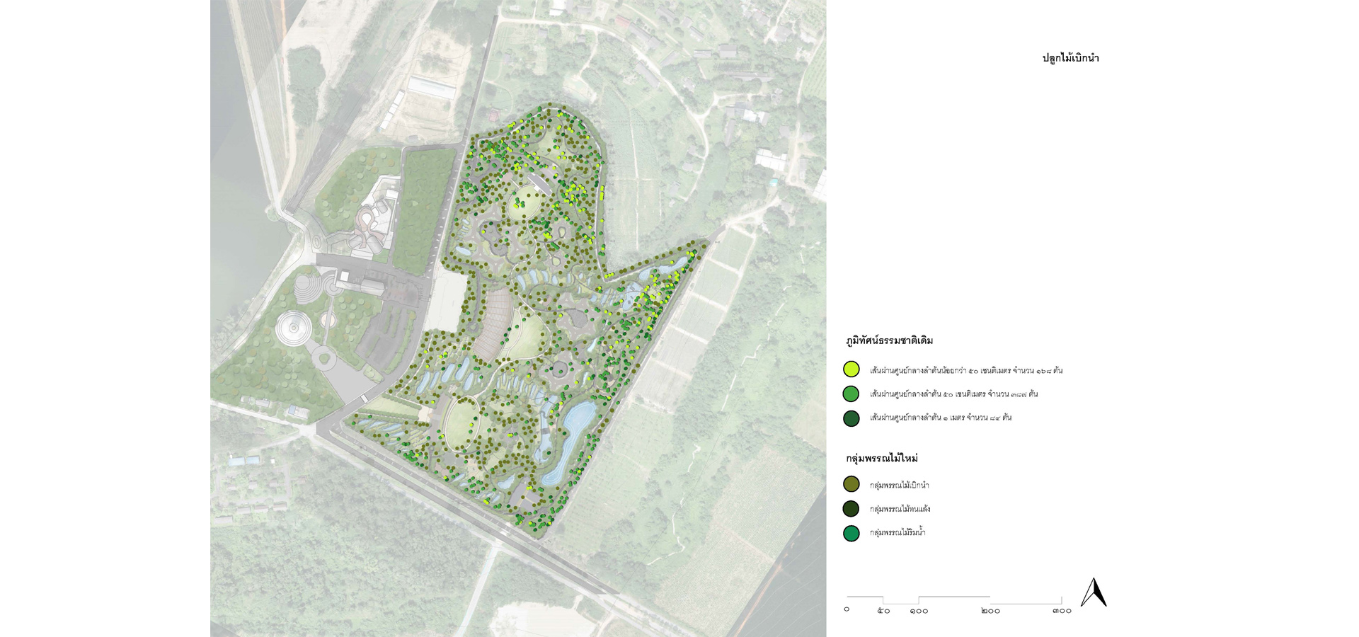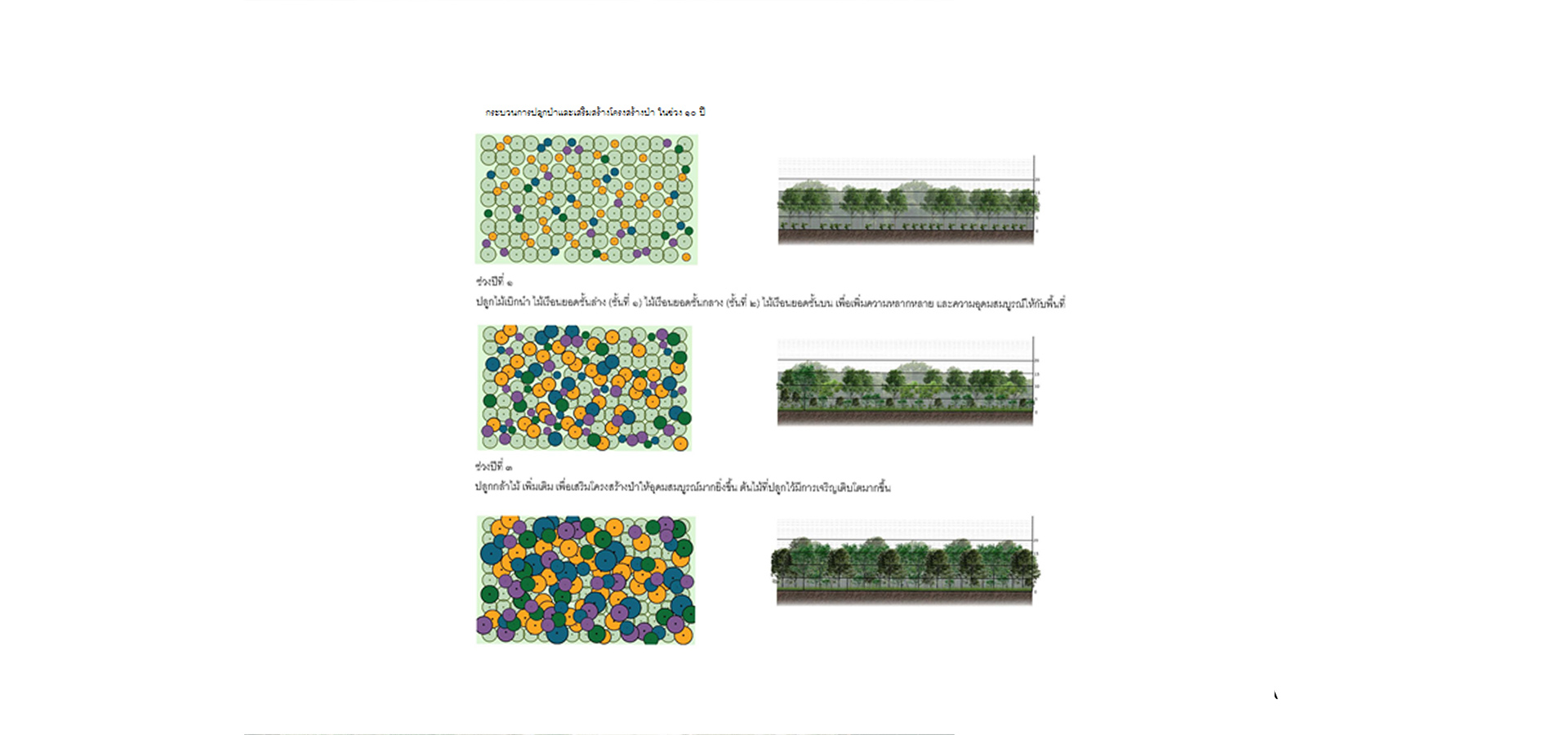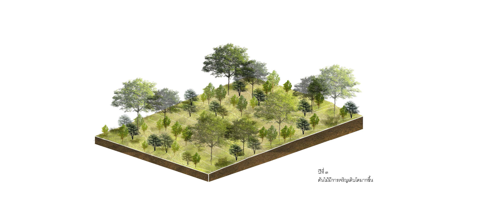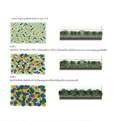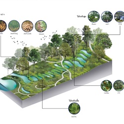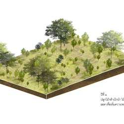 3.1 วิเคราะห์และจัดประเภทกลุ่มต้นไม้เดิมไว้เป็นหมวดหมู่ตามขนาดของเส้นผ่านศูนย์กลางลำต้น ปลูกกลุ่มพันธุ์ไม้เบิกนำ กลุ่มพันธุ์ไม้ทนแล้ง และกลุ่มพันธุ์ไม้ริมน้ำ มีการนำแนวคิด การปลูกป่า 3 อย่างประโยชน์ 4 อย่าง ที่เหมาะสมกับบริบท และทำให้เกิดความยั่งยืน