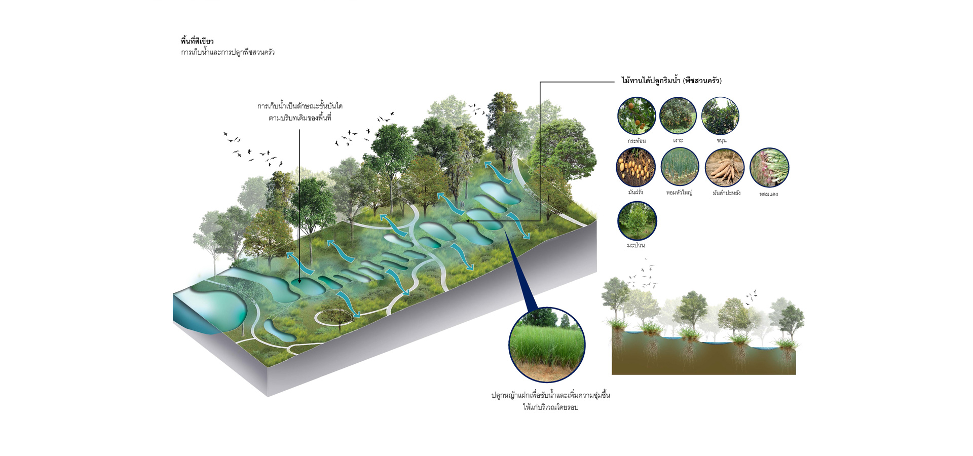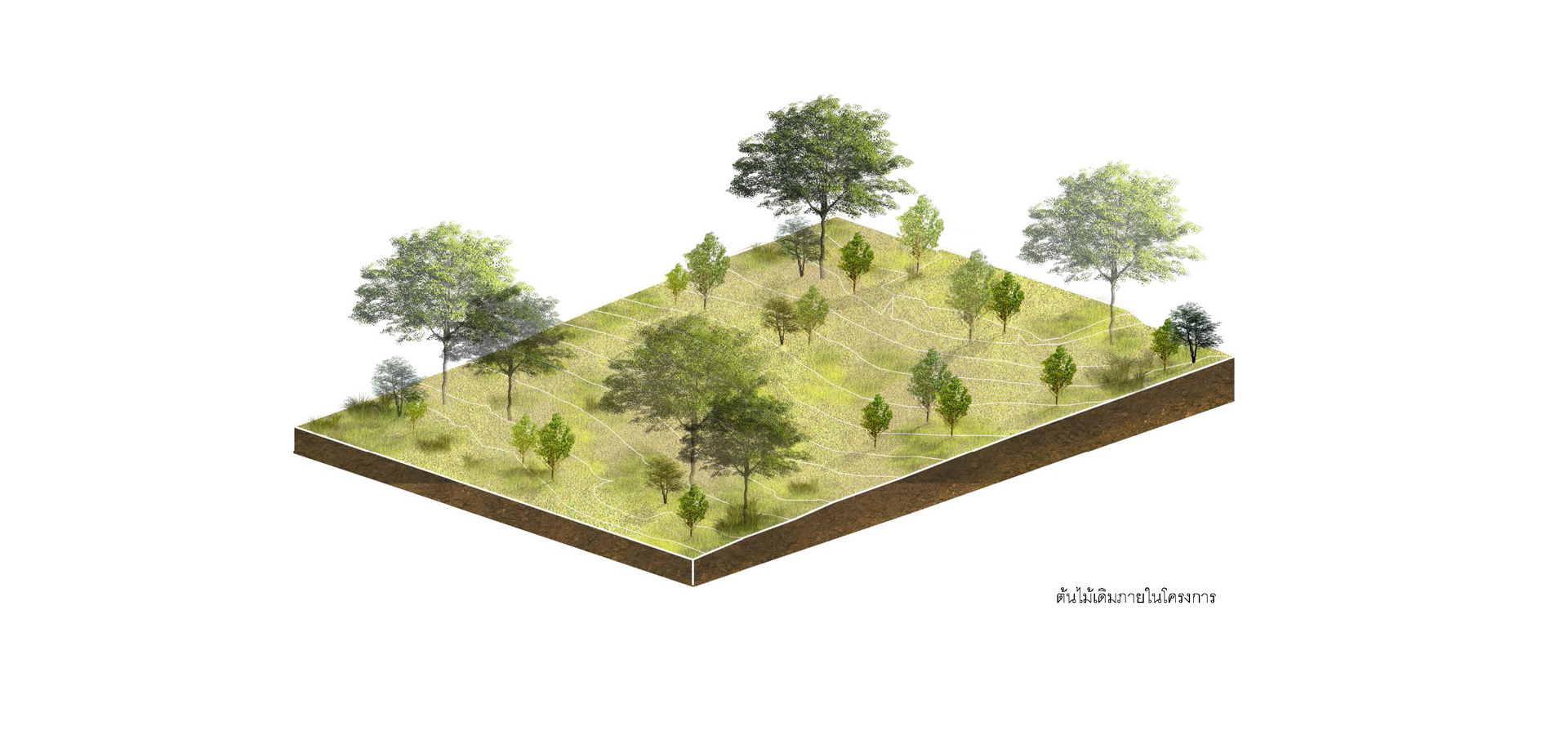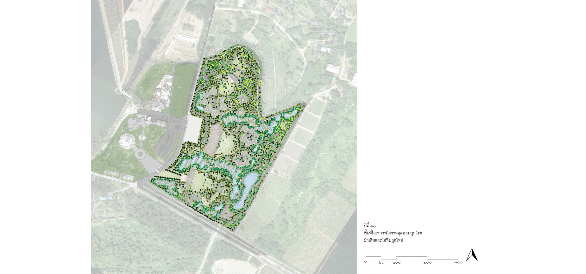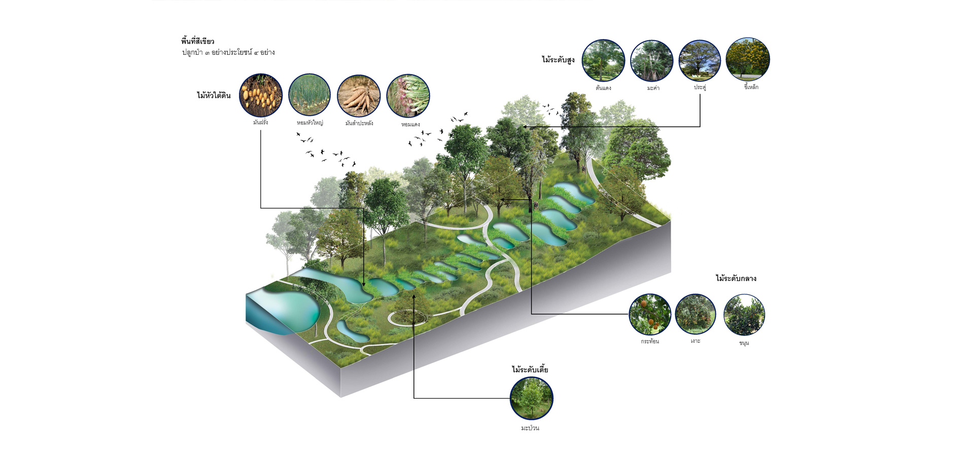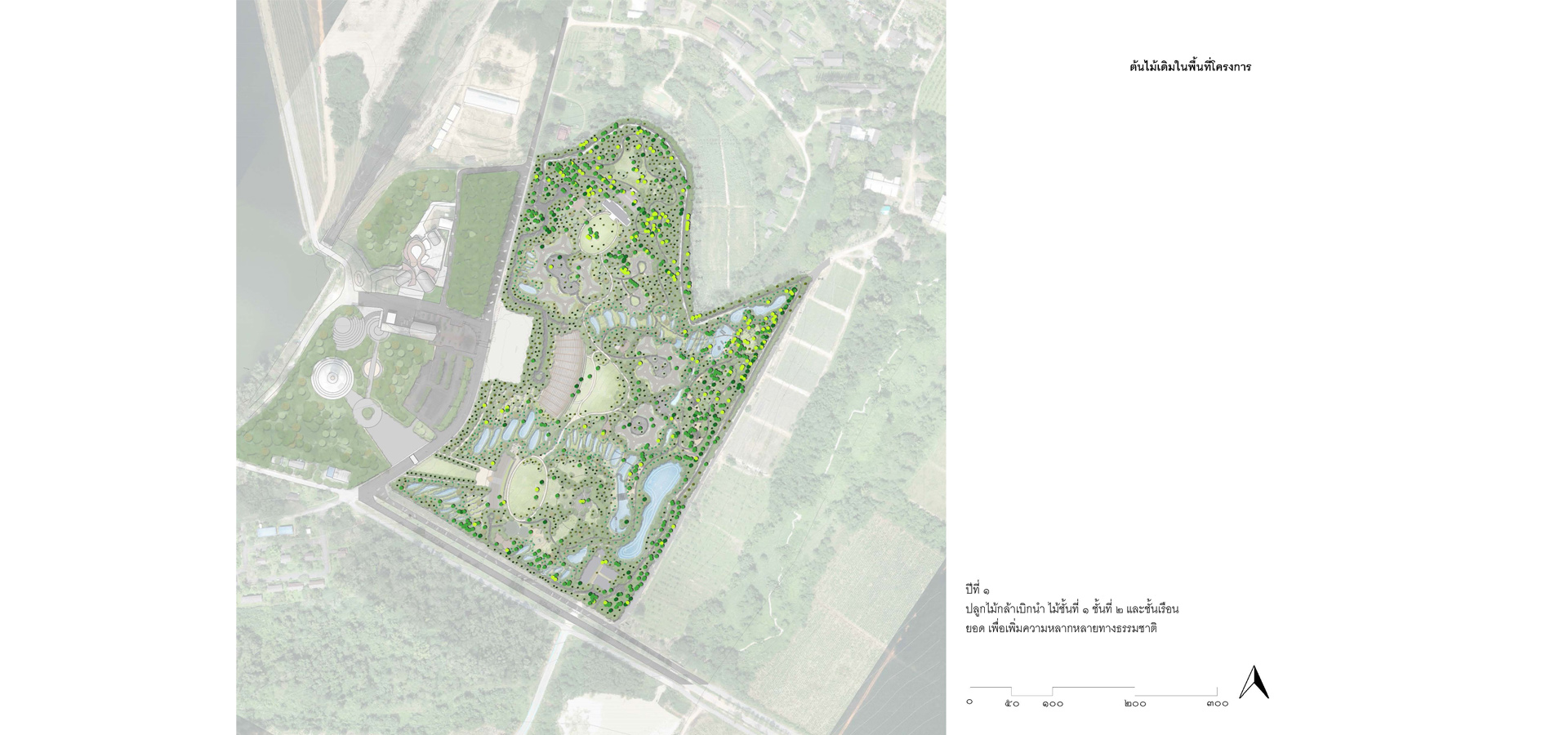 3.1 วิเคราะห์และจัดประเภทกลุ่มต้นไม้เดิมไว้เป็นหมวดหมู่ตามขนาดของเส้นผ่านศูนย์กลางลำต้น ปลูกกลุ่มพันธุ์ไม้เบิกนำ กลุ่มพันธุ์ไม้ทนแล้ง และกลุ่มพันธุ์ไม้ริมน้ำ มีการนำแนวคิด การปลูกป่า 3 อย่างประโยชน์ 4 อย่าง ที่เหมาะสมกับบริบท และทำให้เกิดความยั่งยืน