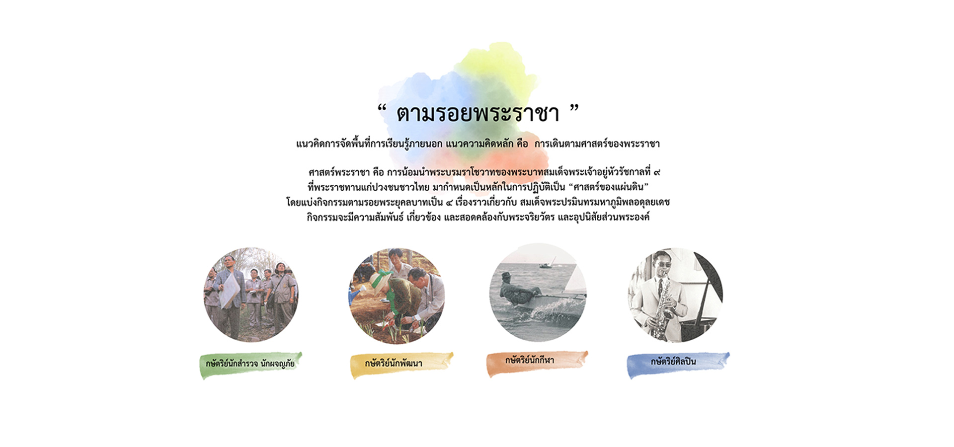 2. กิจกรรมการเรียนรู้ต่าง ๆ ภายในโครงการจะเน้นการออกแบบให้มีความยืดหยุ่นเพื่อสามารถตอบรับกับกิจกรรมการเรียนรู้การเข้าค่ายพักแรม และวิชาพิเศษของหลักสูตรการเรียนรู้วิชาลูกเสือในประเทศไทยในทุกระดับทุกช่วงวัย ตั้งแต่ลูกเสือสำรอง ลูกเสือสามัญ ลูกเสือสามัญรุ่นใหญ่ ลูกเสือวิสามัญ ไปจนถึงการอบรมพัฒนาบุคลากรทางการลูกเสือ โดยเน้นหลักปรัชญาเศรษฐกิจพอเพียง และการพัฒนาอย่างยั่งยืน ผ่านกิจกรรมการเรียนรู้ต่างๆ ในการออกแบบกิจกรรมได้รับแรงบันดาลใจจากในหลวงรัชกาลที่ 9 ที่ทรงมีพระปรีชาสามารถรอบด้าน โดยแบ่งกิจกรรมตามรอยพระยุคลบาทเป็น 4 เรื่องราวเกี่ยวกับสมเด็จพระปรมินทรมหาภูมิพลอดุลยเดช มีความสัมพันธ์เกี่ยวข้องและสอดคล้องกับพระจริยวัตร และอุปสรรคส่วนพระองค์ อันได้แก่ กษัตริย์นักสำรวจ และนักผจญภัย กษัตริย์ผู้เป็นนักพัฒนา กษัตริย์นักกีฬา และกษัตริย์ผู้เป็นศิลปิน