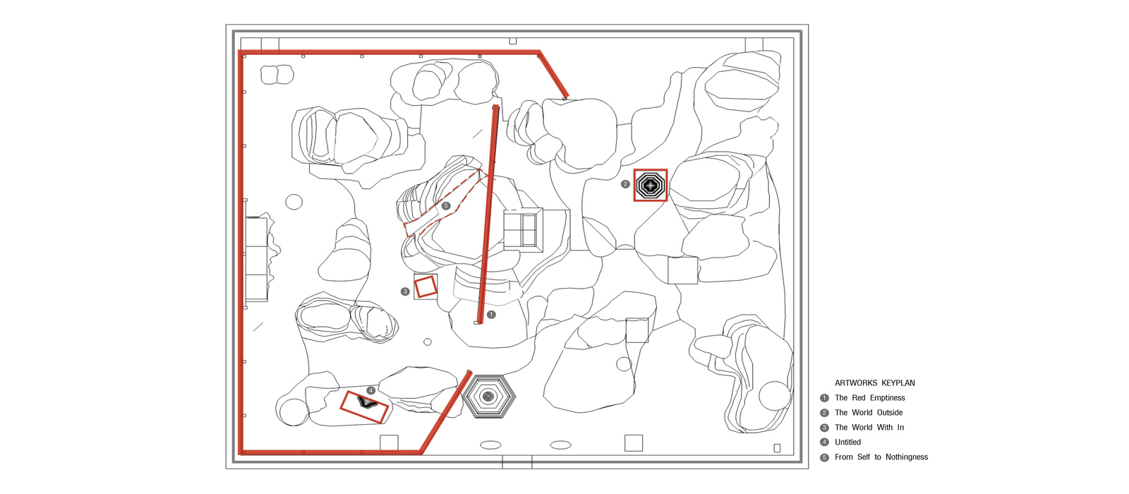 งานศิลปะจัดวางนี้จึงเป็นการเปิดสถานที่ให้ผู้คนได้สำรวจ เดินทาง จากภายนอก มาสู่ภายใน จากการมองภายนอก มาสู่การมองภายใน เปรียบเสมือนการนำพาความสนใจของคน จาก “โลก” ภายนอก มาสู่ “โลก” ภายใน และจากความมีตัวตน สู่ความไร้ตัวตน เป็นการเปิดสู่คำถาม