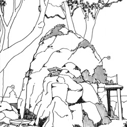 ศิลปะจัดวางในพื้นที่เขามอ เริ่มจากการค้นคว้าประวัติความเป็นมาต่างๆ พบว่า เขามอเป็นพื้นที่พักผ่อนของคนในอดีต โดยมีแนวคิดจำลองจากป่าหิมพานต์ บริบทหนึ่งตามเรื่องเล่าในไตรภูมิ จึงแบ่งเนื้องานเป็น 2 ส่วน หนึ่งการฟื้นฟูเขามอให้กลับมาเป็นพื้นที่หย่อนใจ สองการทำศิลปะจัดวางจากบริบทของพื้นที่ทั้งแนวคิดวางผังเดิมและการใช้งาน