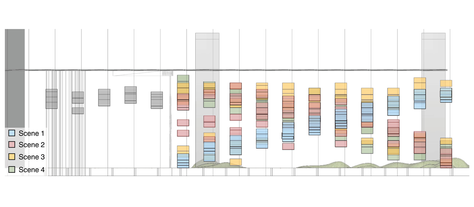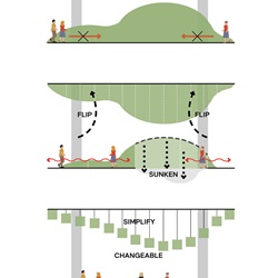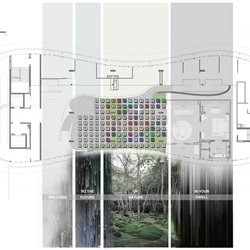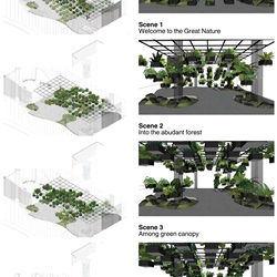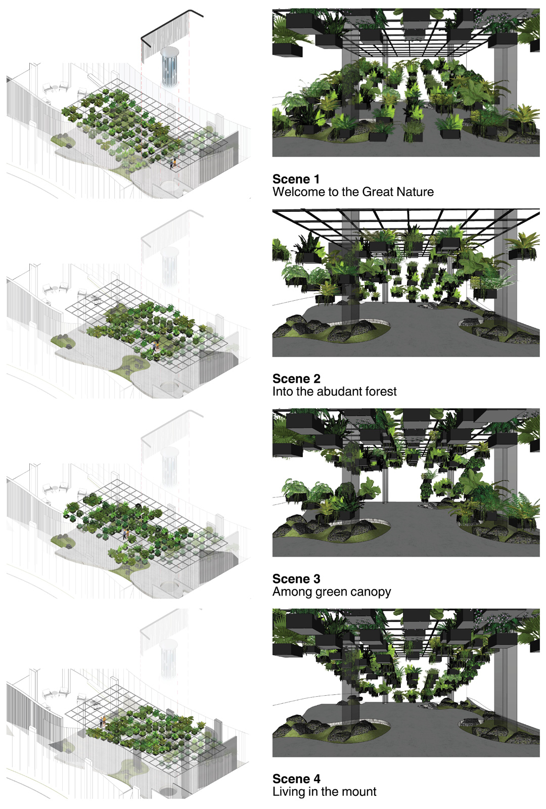 (4.2) Kinetic Zone เป็นการลดทอนป่าเขาที่ยิ่งใหญ่ให้สามารถจัดแสดงภายในอาคารขนาดเล็กได้ในรูปแบบ Installation Art โดยใช้กระบะต้นไม้ที่มีเทคโลโนยี Kinetic (Hanging Kinetic Planter) จำนวนมากที่สามารถเคลื่อนไหวในทางดิ่ง (Vertical Element) ปรับให้มีขนาดและน้ำหนักที่เหมาะสม จัดกลุ่มในลักษณะ Grid Line และออกแบบให้เคลื่อนไหวตามมุมมองของผู้เข้าชม (Scene) ตั้งแต่จุดเริ่มต้น (4.2.1) ผู้เข้าชมจะมองเห็นกลุ่มต้นไม้เสมือนภูเขาที่สูงขึ้นไปทางด้านหลัง (4.2.2) จากนั้นผู้เข้าชมจะเดินเข้าไปอยู่ท่ามกลางกลุ่มแมกไม้ที่ค่อยๆเคลื่อนตัวขึ้นด้านบนเปิดออกให้เห็นธรรมชาติภายใน (4.2.3) เมื่อได้เข้าไปอยู่ภายในจะมองเห็น Hanging garden อยู่รอบตัวทั้ง 360 องศาทั้ง Horizontal และ Vertical (4.2.4) และเมื่อได้เดินไปจนสิ้นสุดส่วนแสดงเมื่อมองกลับมา กลุ่มต้นไม้จะเคลื่อนตัวกลับลงมา กลายเป็นกลุ่มภูเขาที่สูงขึ้นไปทางจุดเริ่มต้นแทน