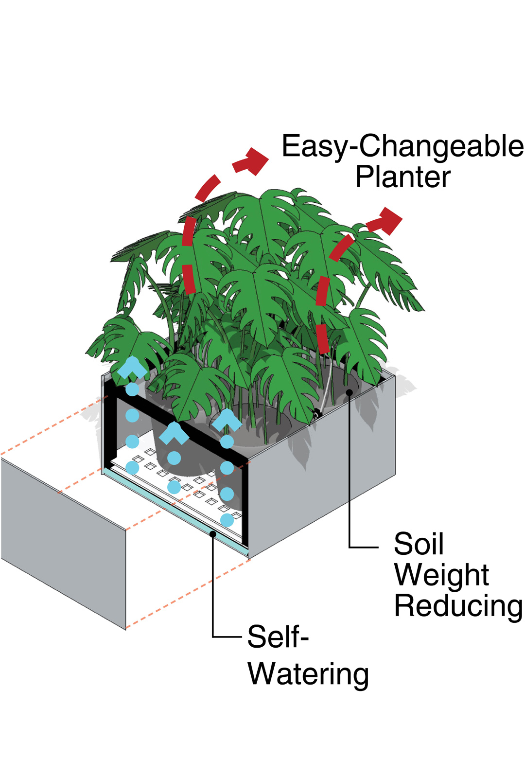 โดยบริเวณ Kinetic zone ออกแบบให้กระบะต้นไม้มีน้ำหนักเบา ด้วยการใช้เทคนิคใส่กระถางต้นไม้เล็กๆไว้ภายในกระบะ Kinetic เพื่อให้ลดปริมาณน้ำหนักดินปลูก ทั้งช่วยลดน้ำหนักให้กับเครื่อง Kinetic และสามารถเปลี่ยนแปลงพืชพรรณได้ง่ายเพียงแค่นำกระถางเล็กๆภายในออก นอกจากนั้นยังใช้เทคนิค Self-Watering เพื่อลดความชื้นในอากาศ โดยมีพื้นที่ใส่น้ำไว้ด้านล่างของกระบะ และใช้วัสดุที่สามารถสะท้อนแสงปิดผิวไว้ด้านล่าง เพื่อให้สะท้อนพืชพรรณสีเขียวด้านล่าง เพิ่มพื้นที่ทางธรรมชาติให้ดูกว้างขึ้น