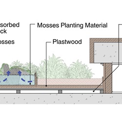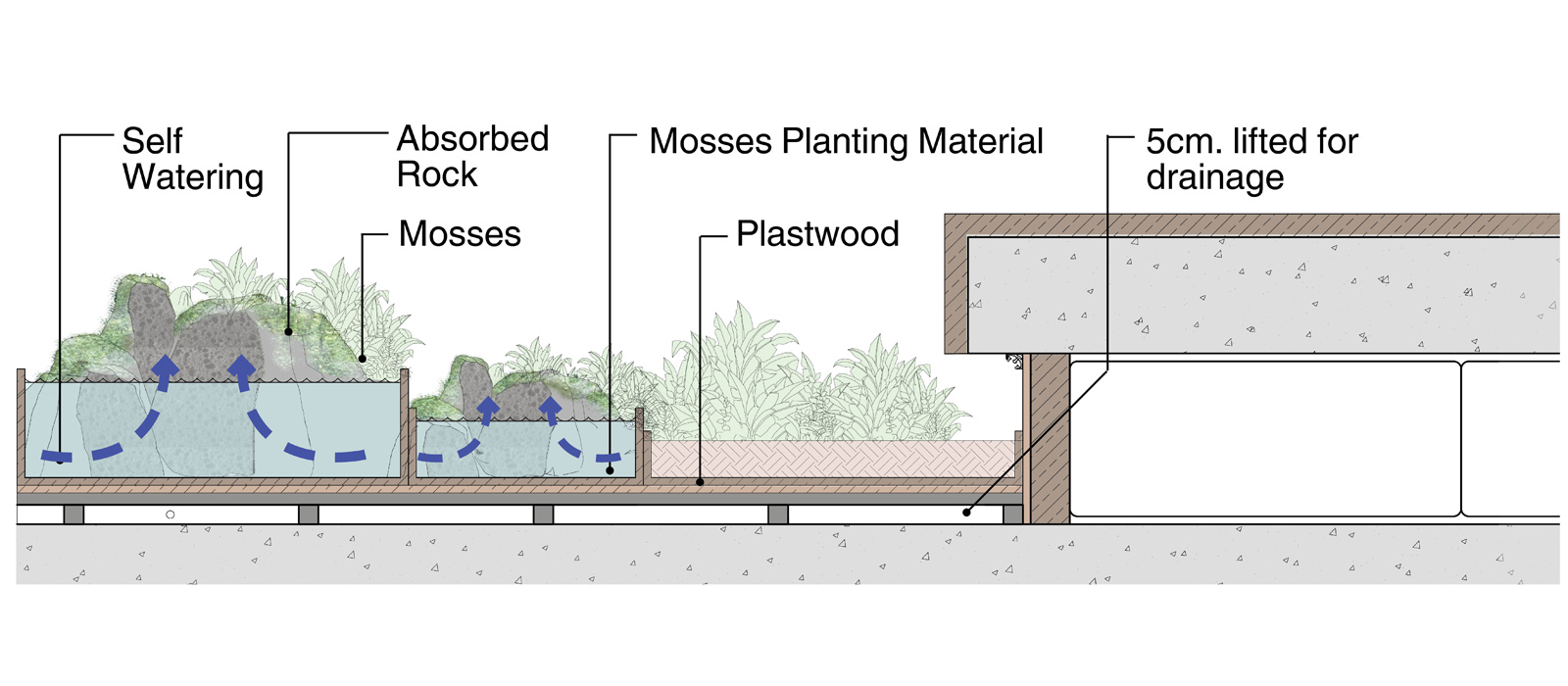 การให้น้ำพืชพรรณในบริเวณ Moss zone ได้ออกแบบให้เป็นกระบะต้นไม้ที่ลึกลงไป สามารถใส่น้ำไว้ภายในคอยรักษาความชื้น และสามารถปรับเปลี่ยนปริมาณน้ำได้ตลอดเวลา ใช้หินฟองน้ำภายในกระบะ เพื่อเก็บความชื้นในหินหล่อเลี้ยงมอสได้ โดยเทคนิคนี้มีประโยชน์ในการป้องกันความชื้นที่มากเกินจนส่งผลกระทบต่อสภาพแวดล้อมภายในอาคาร เช่น เครื่องปรับอากาศและวัสดุพื้นผิวตกแต่งภายในอาคาร นอกจากนั้นยังได้เลือกใช้พรรณไม้ทนร่ม และทนอากาศแห้งได้ดี