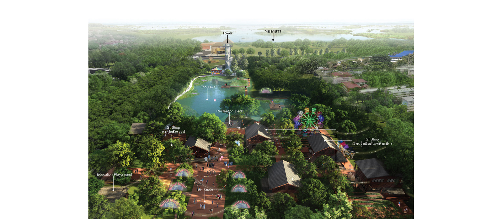 6.Creating of self-sustainable ecology making the water treatment area using natural plants which represents the distinguished identity of the area as Wetland i.e., Nong Han. Besides, the design of the project also concerns about keeping all existing trees in the area.