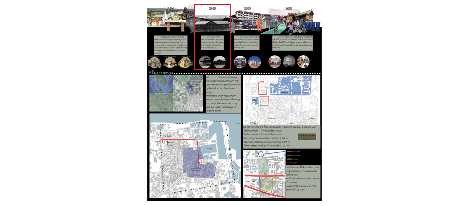 Sai Sawang road in Sakon Nakhon city is a road that leads to the existing cultural learning area of the city, for example, Nong Han Museum, Phu Phan Museum, Science Museum, and Commempration Park which are important learning centers of the city but still are not well utilized as learning or tourism centers. Besides, more than 120-year-old Sakon Nakhon’s old correctional institution which located in the same area is as big as 21 Rai (33,600 SQM) and consists of 2 teak wood prison buildings in unique architectural style, has been abandoned in the city center. Leaving it unattended may lead to many other problems such as visual pollution, deteriorating area, insecurity issue. All can cause negative effects to the surrounding both in community level and overall picture of the city.