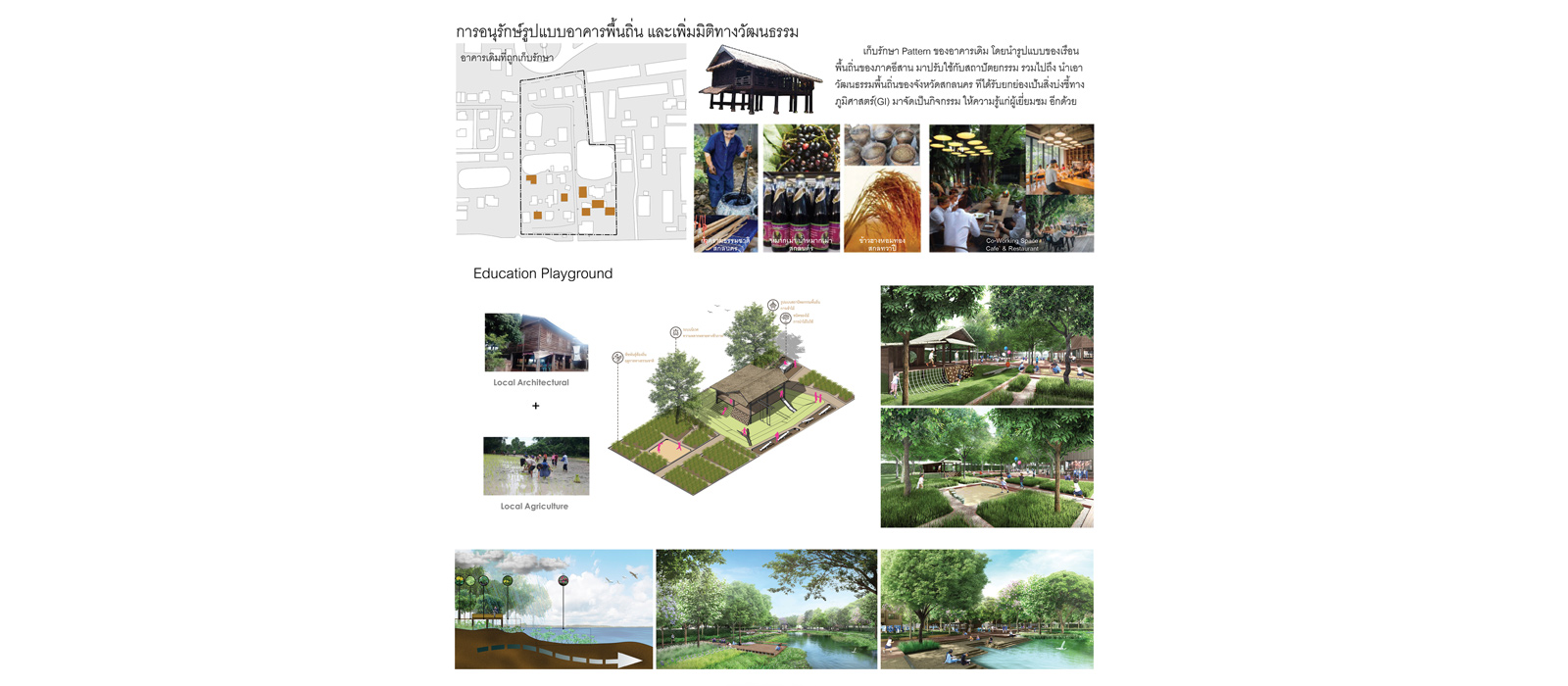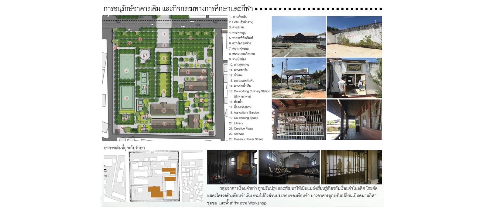 Therefore, the objective of the space design for utilizing the area of Sakon Nakhon’s old correctional institution is to build up the opportunity to improve the quality of life and economy of the city from existing values and form the creative space that benefits the community and its visitors.