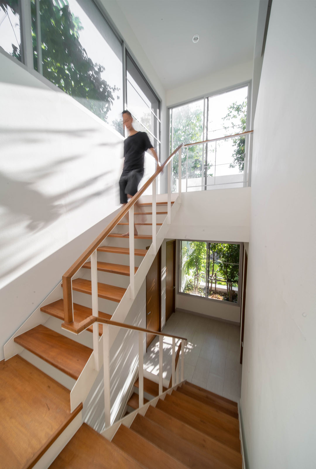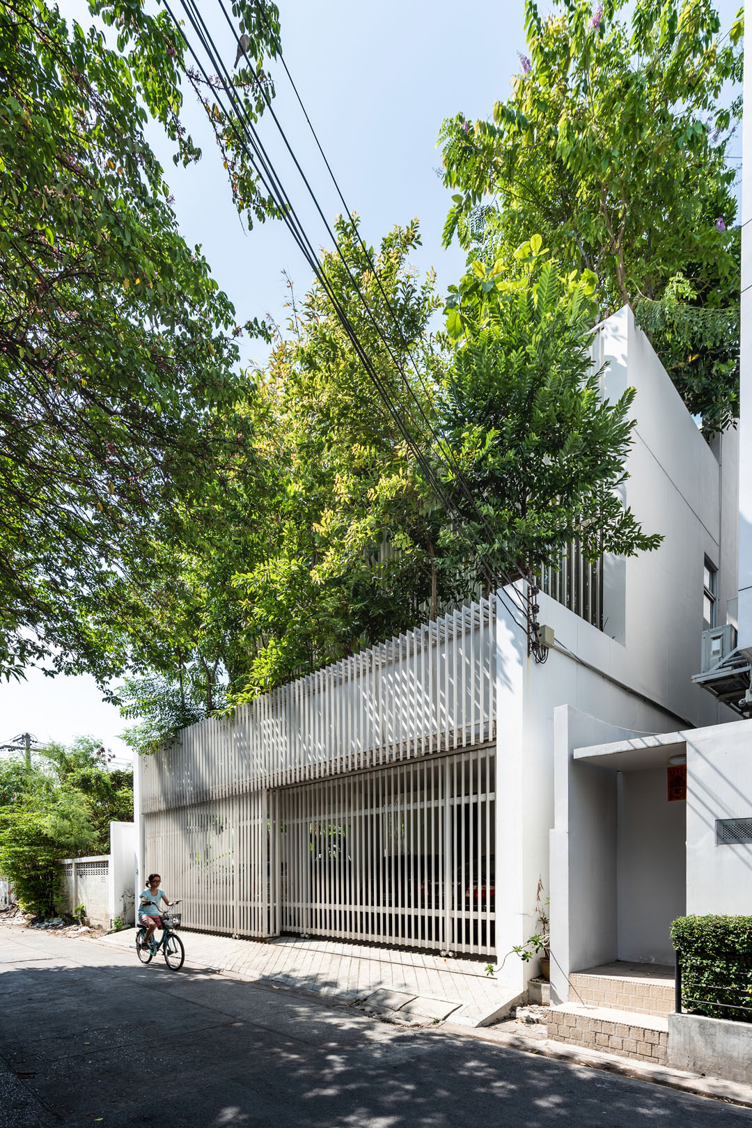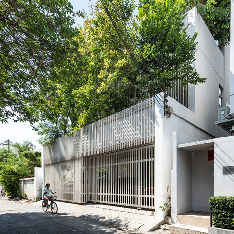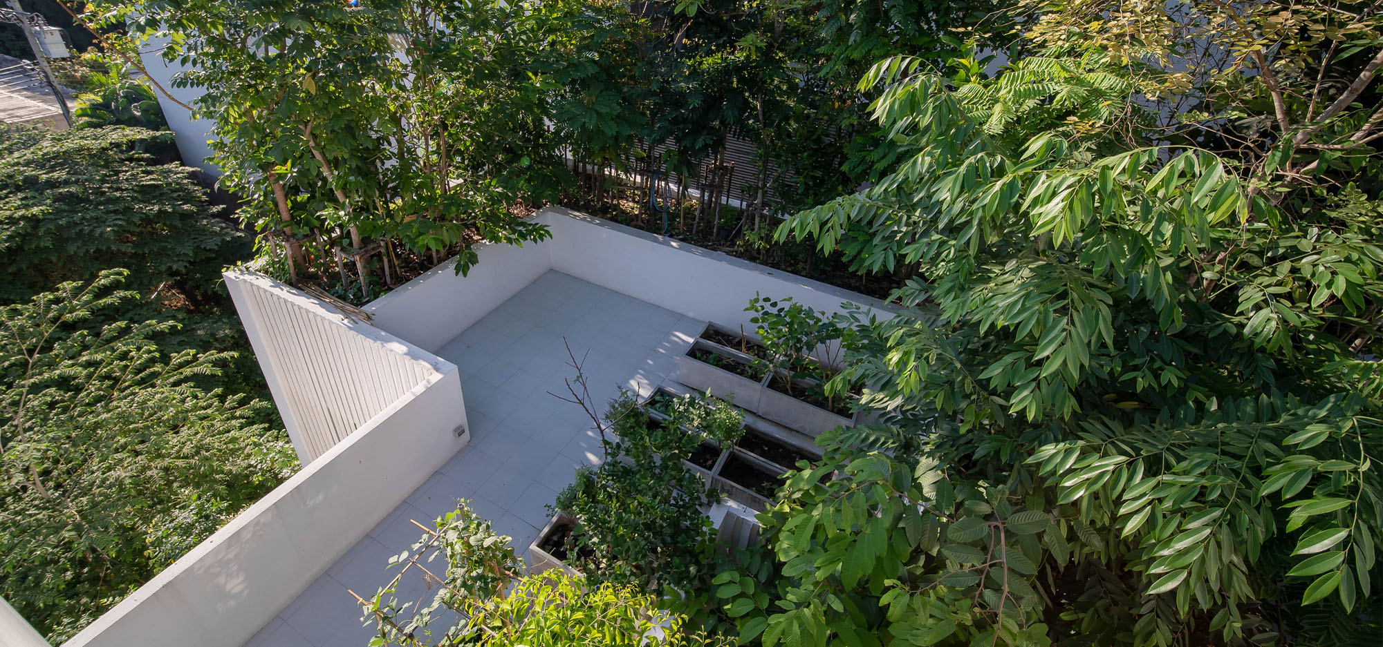 บนชั้นสองมีภาชนะปลูกต้นไม้อยู่ฝั่งหน้าบ้าน เพื่อสร้างความเป็นส่วนตัวให้ห้องนอนซึ่งหันหน้าไปหาถนนสาธารณะ บริเวณสวนก็ปลูกต้นไม้ใหญ่สูงไปถึงชั้นสอง เพื่อเชื่อมพื้นที่สีเขียวจากสวนไปยังห้องนอน