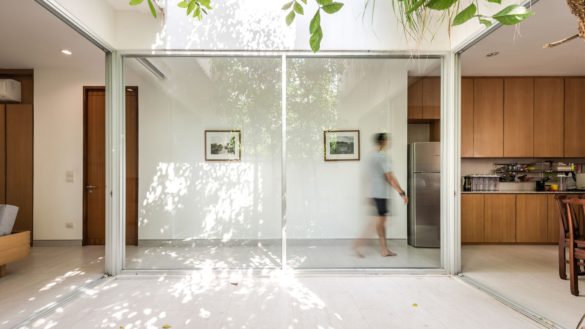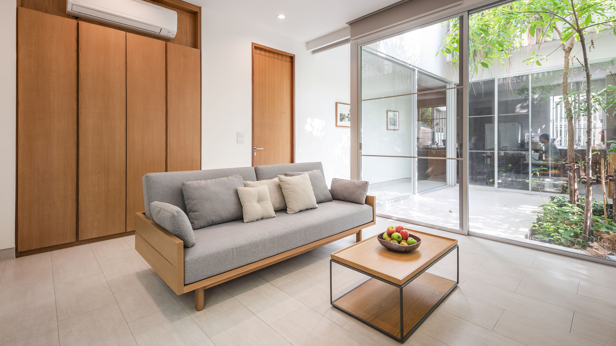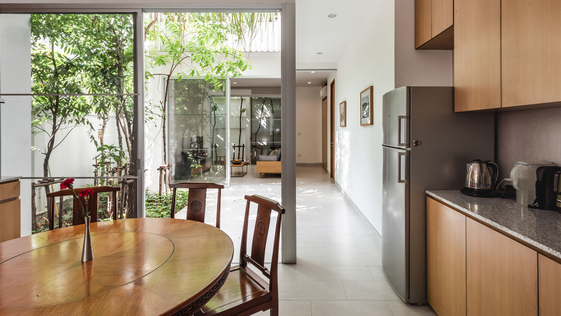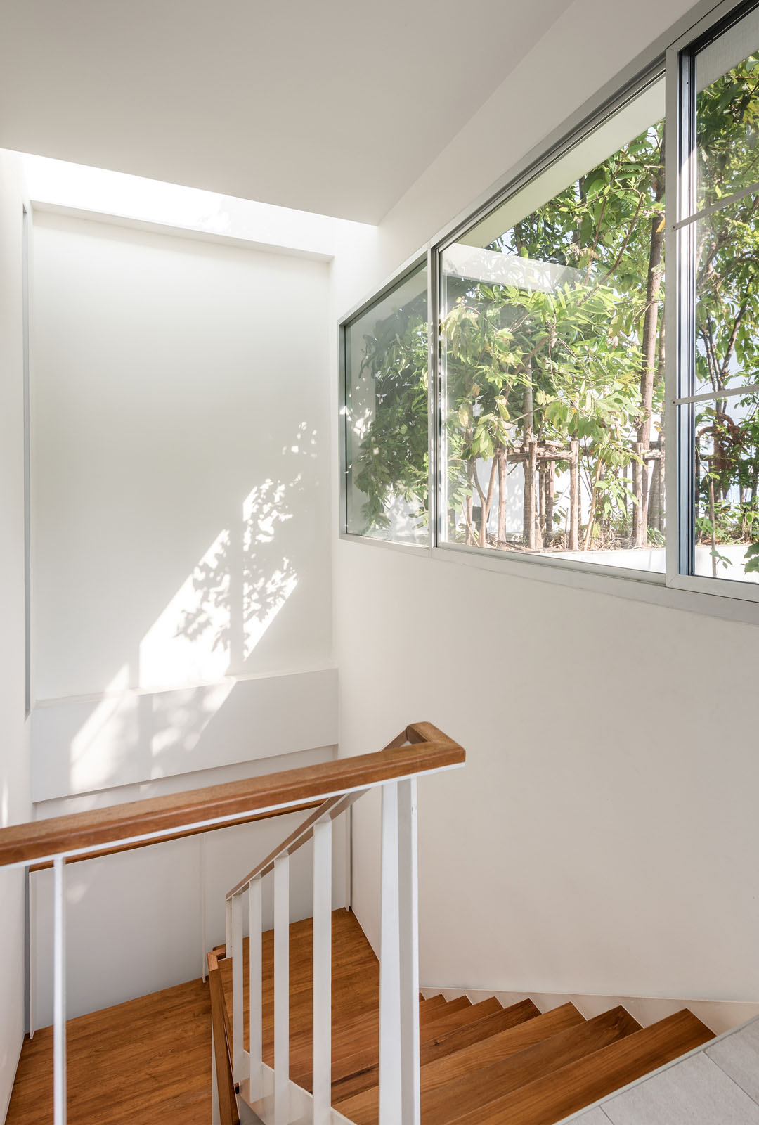 บนชั้นสองมีภาชนะปลูกต้นไม้อยู่ฝั่งหน้าบ้าน เพื่อสร้างความเป็นส่วนตัวให้ห้องนอนซึ่งหันหน้าไปหาถนนสาธารณะ บริเวณสวนก็ปลูกต้นไม้ใหญ่สูงไปถึงชั้นสอง เพื่อเชื่อมพื้นที่สีเขียวจากสวนไปยังห้องนอน