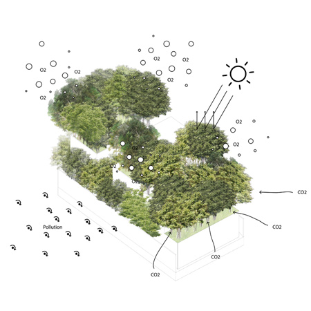 โครงการ Forest House สะท้อนแนวโน้มการเติบโตของเมืองในปัจจุบัน ในพื้นที่ขนาดเท่าเดิม บ้านหลังเล็กที่มีพื้นที่สวนถูกแทนที่ด้วยบ้านหลังใหญ่ขึ้น และสวนขนาดเล็กลงหรือไม่มีเลย โครงการ Forest House จึงเพิ่มพื้นที่สีเขียวทดแทนให้มากที่สุด โดยใช้พื้นที่หลังคา ระเบียง และส่วนอื่นๆ การออกแบบที่ ประณีตทำให้ปลูกต้นไม้เข้าไปในพื้นที่ได้ถึงกว่า 100 ต้น มีงานวิจัยระบุว่าต้นไม้หนึ่งต้นสามารถผลิตออกซิเจนสำหรับสองคน เท่ากับต้นไม้ในโครงการนี้จะผลิต ออกซิเจนสำหรับคนได้ถึง 200 คนเลยทีเดียว