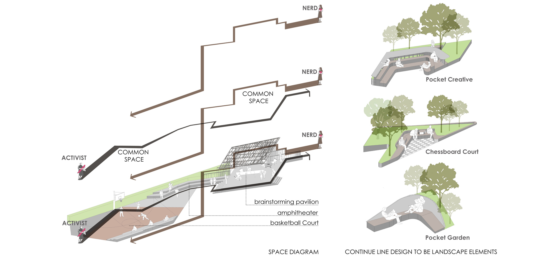 However, there are some spaces that both Nerd and Activist will spend their time together like brainstorming pavilion and street basketball area that visually and functionally connected.