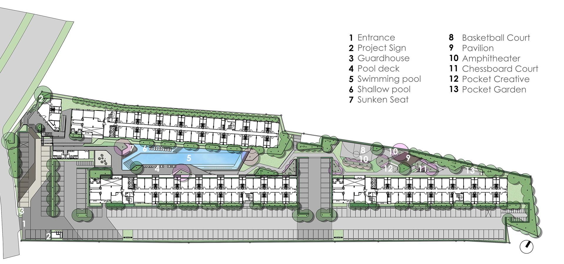 รูปแบบการวางผังมีที่มาจากรูปร่างของที่ดิน ที่มีลักษณะยาว ด้านกว้างอยู่ติดถนน แล้วสอบเข้าทางด้านปลายที่ดิน การวาง อาคารจึงเป็นลักษณะอาคาร A และ B อยู่ด้านที่กว้าง หันหน้าเข้าหากันให้เกิดความเป็น Courtyard ที่มีอาคารสโมสรอยู่ตรงกลางเพื่อความเป็นจุดเด่นต่อเนื่องกับสระว่ายน้ำที่ต่อเนื่องกับสวนที่ไหลไปยังหน้าอาคาร C ที่อยู่ด้านปลายสอบของที่ดิน เป็นพื้นที่ที่แคบกว่าแต่ก็ ได้ความเป็นส่วนตัวมากกว่าด้านหน้า