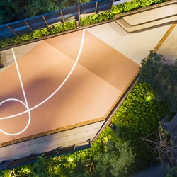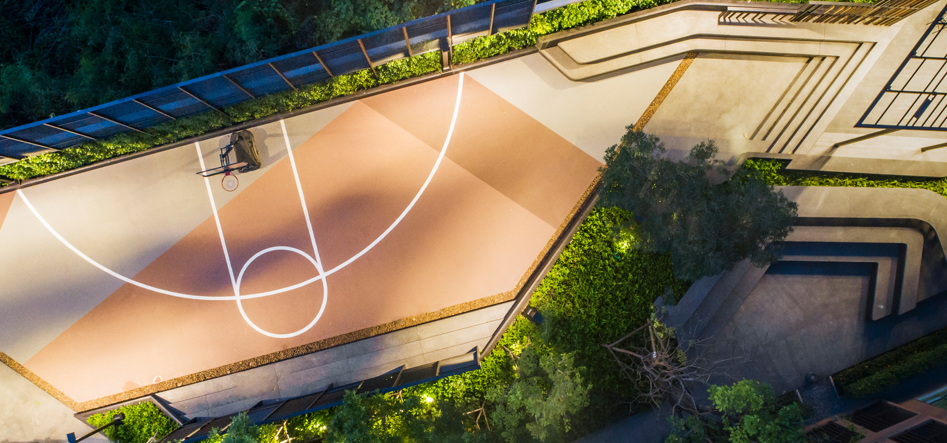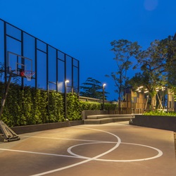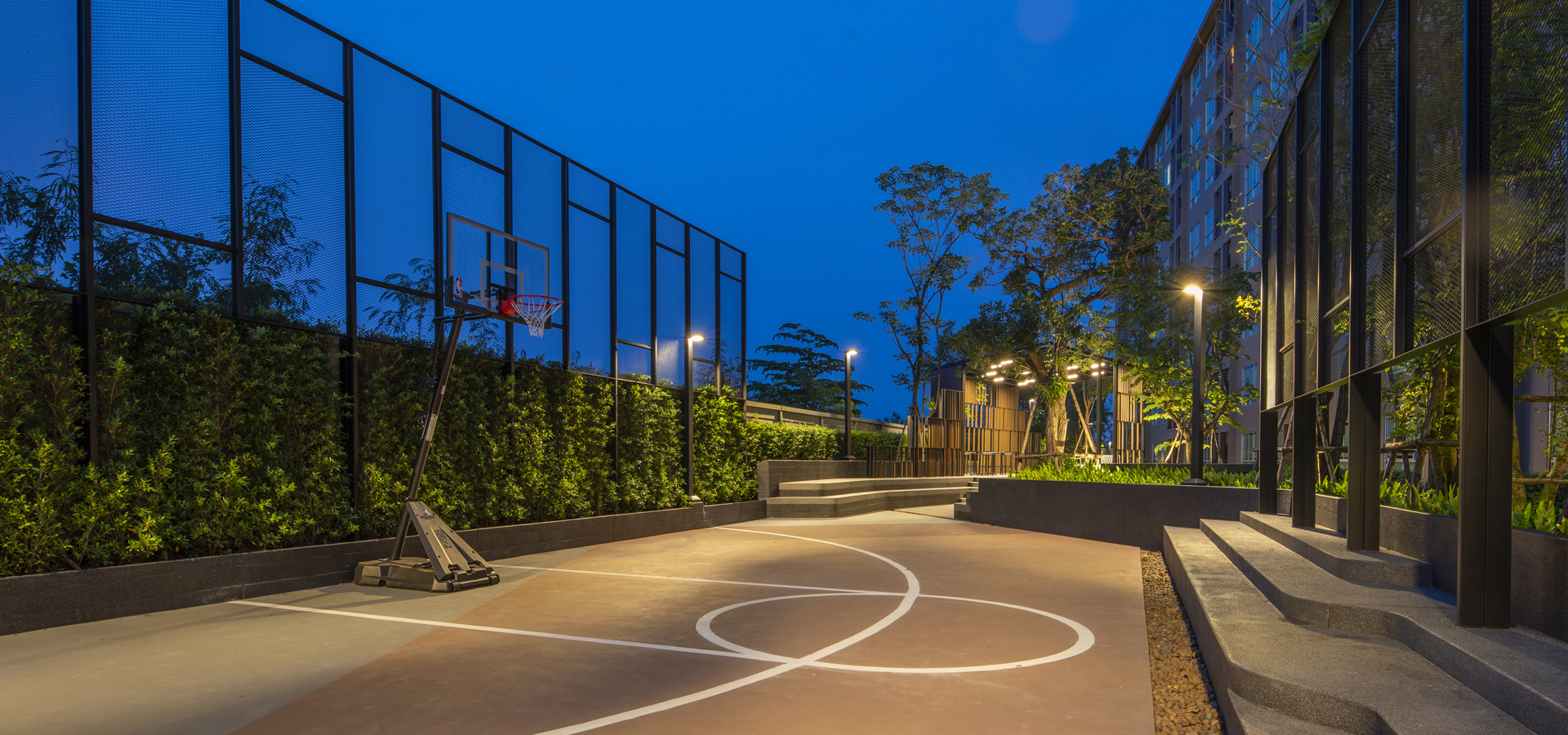 สนามบาส และ Brainstorming Pavilion เป็นจุดสำคัญของเส้นสายที่ตัดกันทั้งเอียงแบบเด็กเล่น และเส้นตั้ง Random แบบเด็กเรียน แสดงถึงพื้นที่ส่วนกลางที่ทุกคนใช้ร่วมกันได้ มีความต่อเนื่องกันของพื้นที่สนามบาสมีการใช้วัสดุสะท้อนแสงที่พื้นเป็นเส้นของ สนาม วัสดุนี้สามารถเก็บกักแสงในตอนกลางวัน แล้วปล่อยความเรืองแสงในตอนค่ำได้ ในขณะที่ Brainstorming Pavilion มีการใช้ผนังโปร่งแสง และสามารถใช้ปากกาเขียนลงไปเพื่อเป็น Brainstorm Board ในระหว่างการคุยงาน ซึ่งสามารถลบออกได้ภายหลัง เป็นวัสดุ รุ่นใหม่ที่ตอบสนองการใช้ชีวิตของนักศึกษาได้ดี