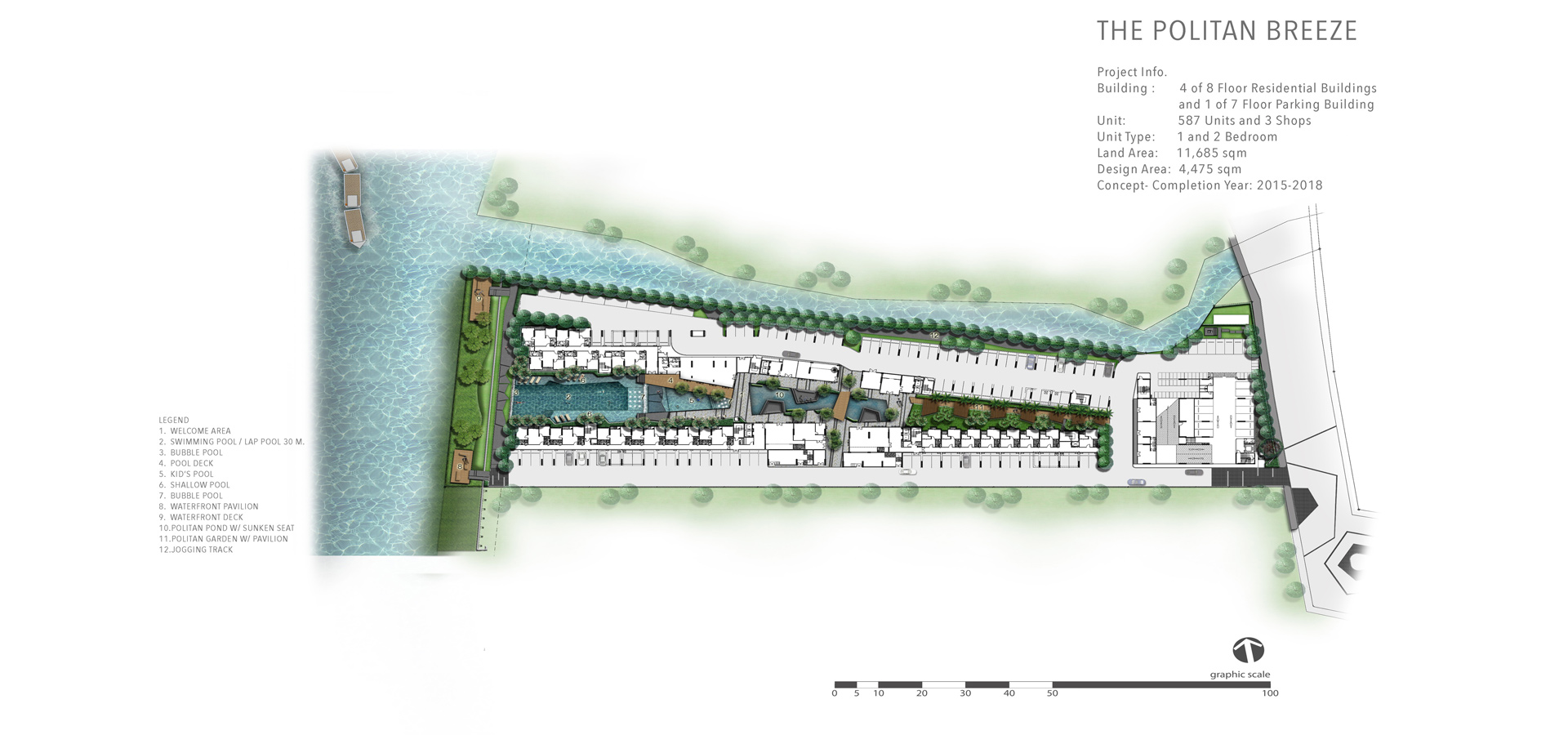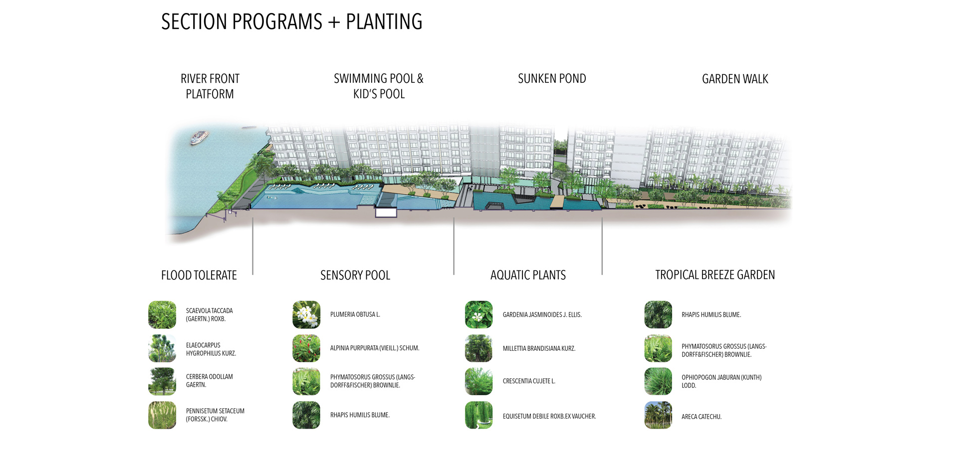 The green space is long and narrow; however, the designers overcame this challenge by proposing the space to gradually get larger therefore creating a wider perception toward the river. The designers aimed at giving residents the ultimate outdoor experience to compensate for the limited room area by creating the sense of an expanding social space. Water and plant materials are the key landscape elements used to create a variety of outdoor activities along this green corridor. The programs included; Politan garden walk, Politan Sunken Pond, Kid Pool and Swimming Pool