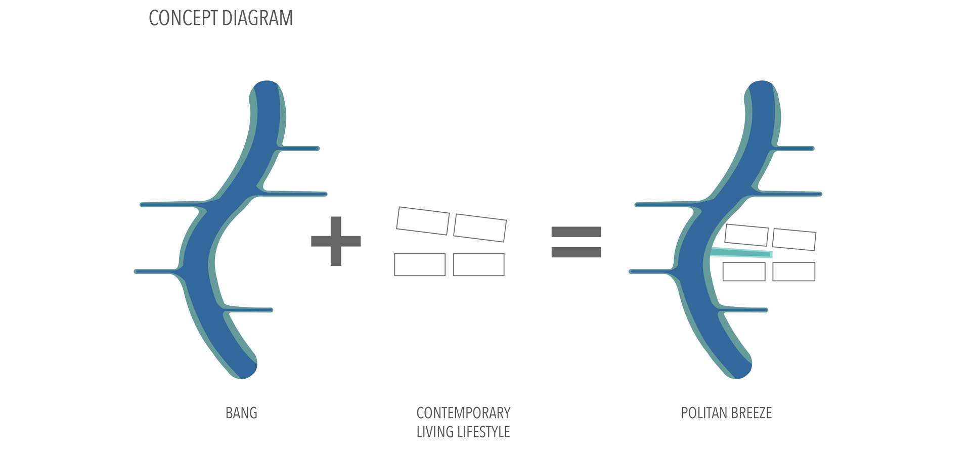 แนวคิดในการออกแบบได้แรงบันดาลใจมาจากคำว่า “บาง” ซึ่งในบริบทของไทย คือการตั้งถิ่นฐานในบริเวณที่มีน้ำหรือลำคลองพาดผ่าน มาเป็นต้นแบบในการสร้างพื้นที่ส่วนกลาง ที่มีน้ำเป็นองค์ประกอบหลักผสานไปกับพื้นที่ใช้สอย พรรณไม้พื้นถิ่นและอาคารสมัยใหม่โอบล้อมพื้นที่ตามความเป็นอยู่แบบ”บาง”จากในอดีต