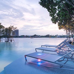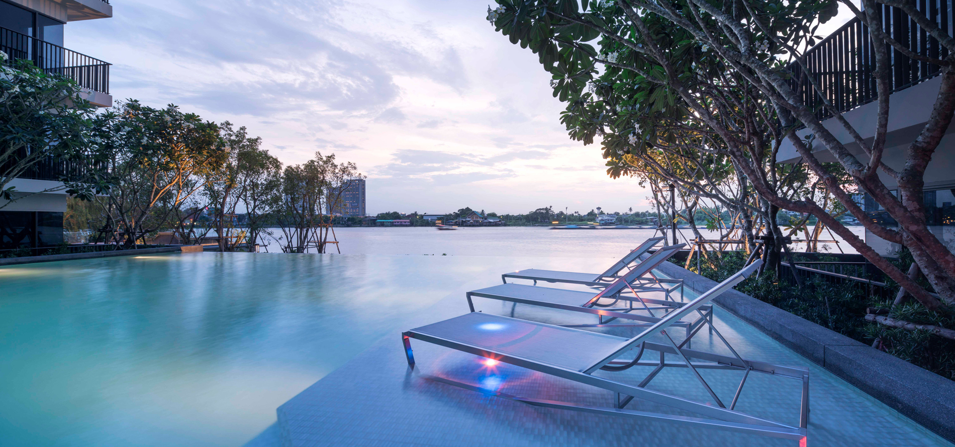 จุดเด่นของที่นี้คือสระว่ายน้ำ Infinity pool ที่นอกจากการเลือกใช้วัสดุพื้นผิวที่ให้ความสว่างกับพื้นที่และขับสีแม่น้ำให้ดูสะอาด งามตาแล้ว ยังออกแบบให้ยกสูงขึ้นเพื่อสร้างมุมมองใหม่ที่เชื่อมต่อไปยังเจ้าพระยา ด้วยเสียงของน้ำที่ไหลตกลงมาช่วยให้เกิดความรู้สึกพักผ่อนและตัวกำแพงน้ำล้นก็ทำหน้าที่เป็นส่วนต้อนรับเข้าสู่บริเวณริมน้ำของโครงการ ตลอดแนวของสระว่ายน้ำ ได้ตั้งใจปลูกต้นลีลาวดีให้เอนชายเพื่อเป็นกรอบให้กับทัศนียภาพของแม่น้ำ อีกทั้งให้ร่มเงาและผ่อนคลายจากกลิ่นของดอกลีลาวดีผลกระทบกับสิ่งแวดล้อมและข้อคำนึงถึงในงานออกแบบ