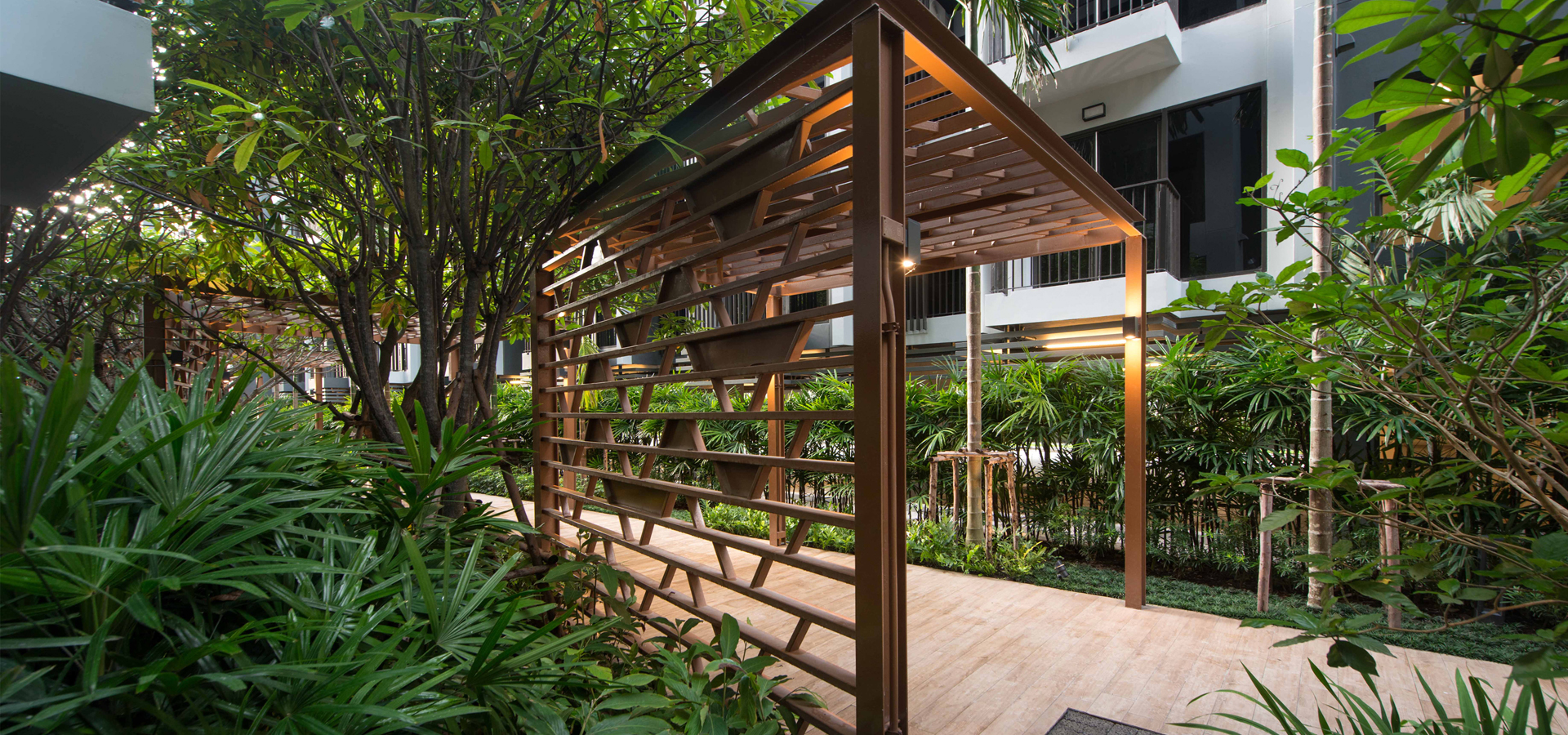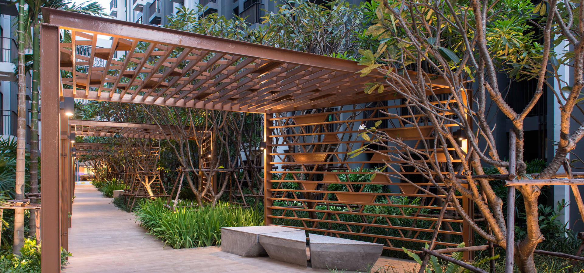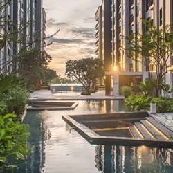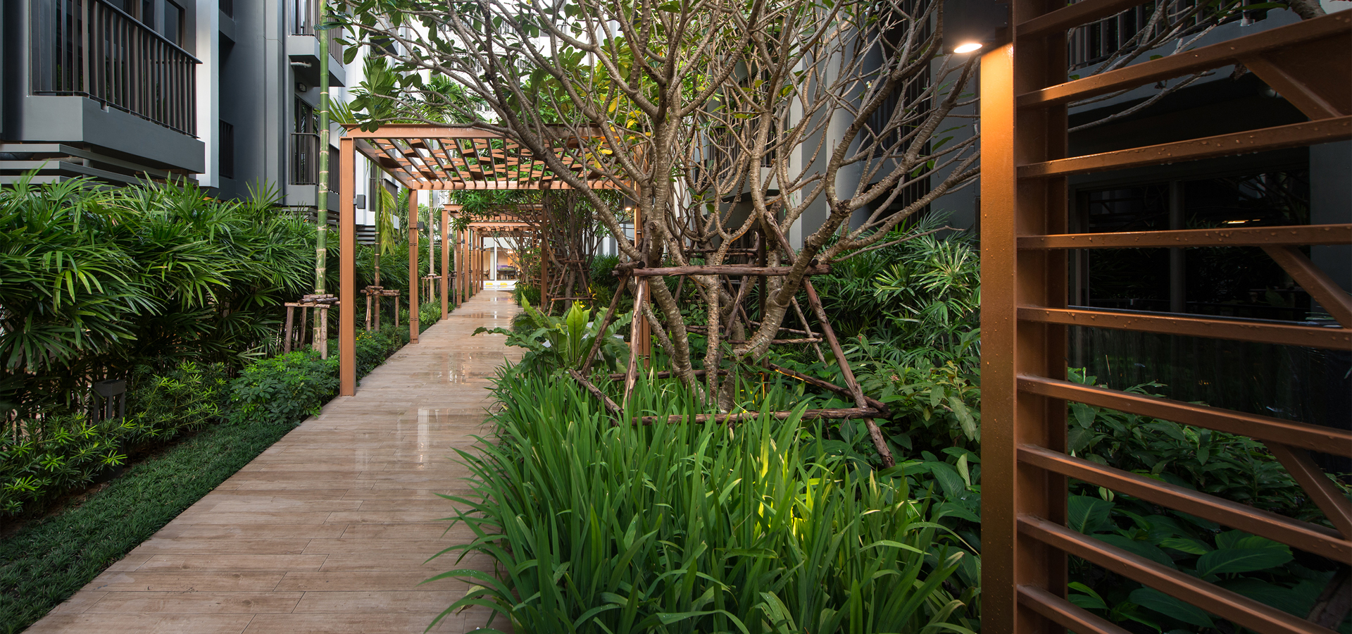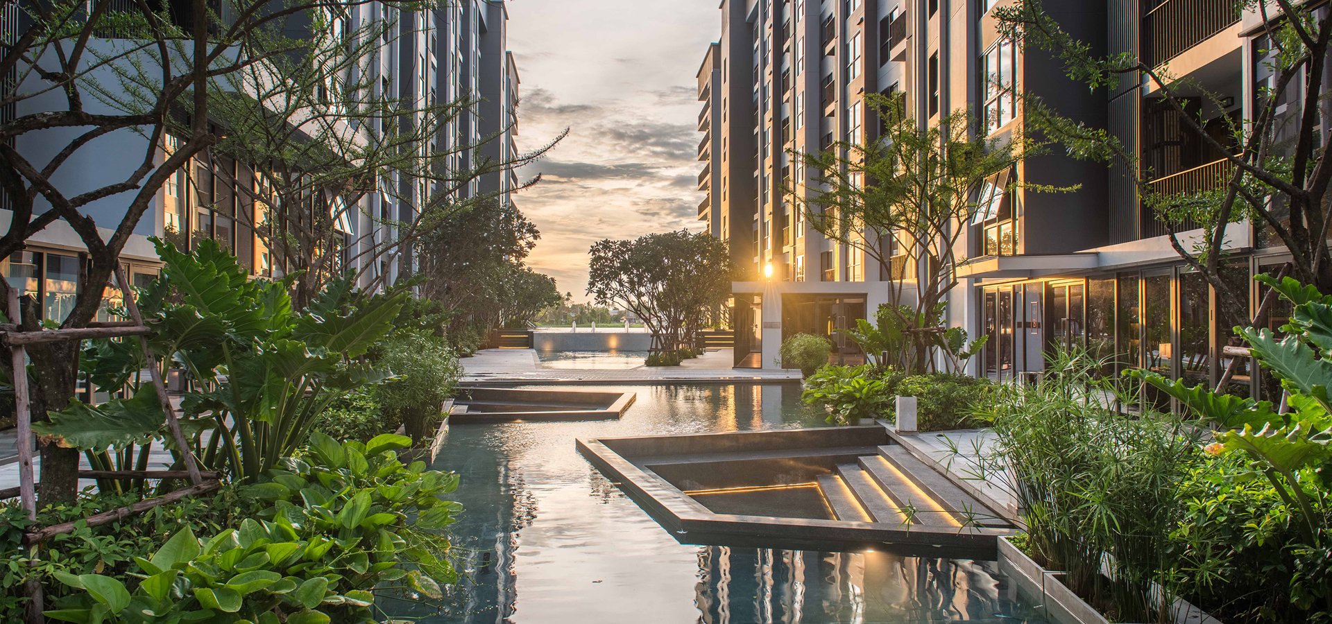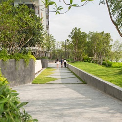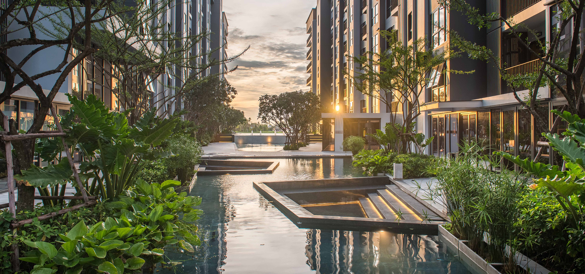 The landscape design idea is derived from the Thai concept of “Bang”. The word “Bang” refers to the settlement areas along the naturally formed distributary canal of the river. The landscape architects interpreted the concept of “Bang” to form a central green space that was integrated into the surrounding modern residential buildings.