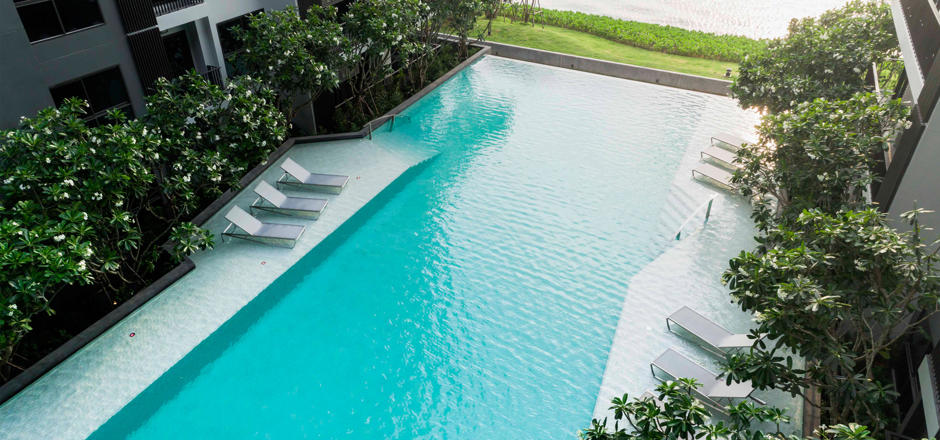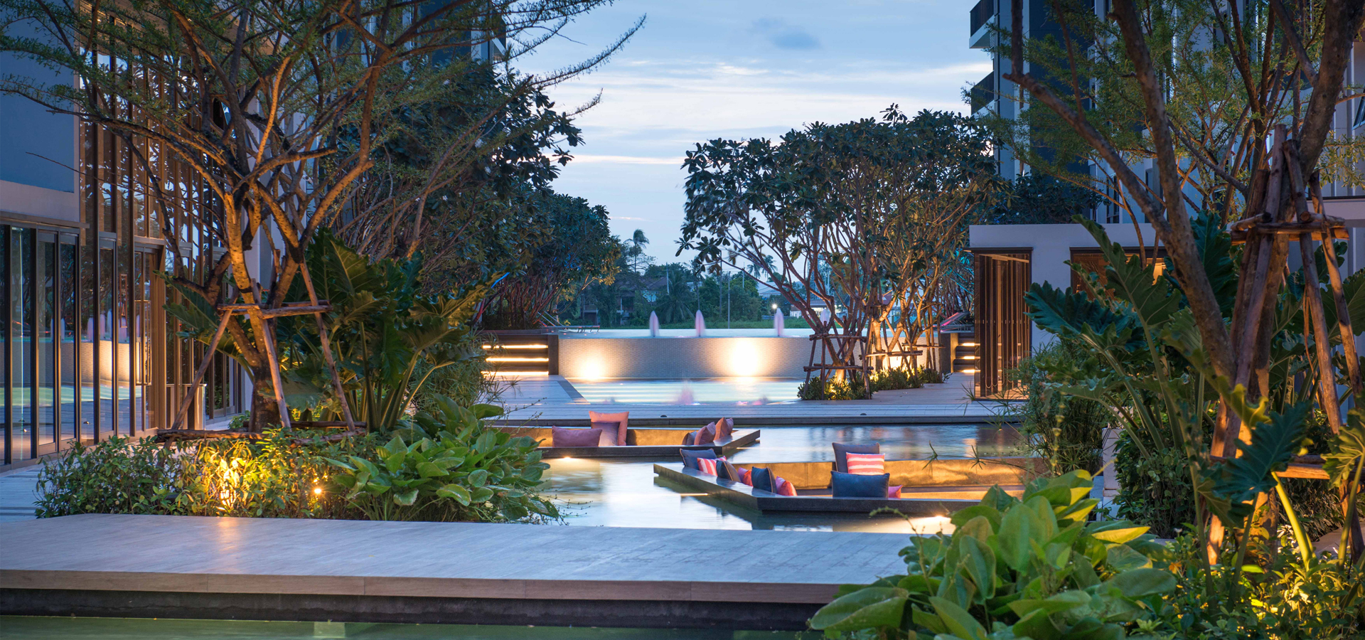 From the narrow garden walk, the residents will be stunned by the expansion of the space. Using water and dynamic design line, the designers create a visual connection to the swimming pool and the river. At the Politan Pond, the seats are designed to be sunken into the water to give illusion of wider space, while also promoting the sense of immersion with natural aqua plants. The edge of sunken pond gives the sense of living close to water and being surrounded by a resort atmosphere.