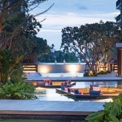 With unique site settings, the design team interpreted the concept of river-centric Thai settlement to form a central green space by using water as a key landscape element that harmoniously ties the built landscape together with a natural river context. The Water as the highlight offers various outdoor spaces including; sunken pond, kid’s pool and infinity pool that celebrate the successful and beautiful resort atmosphere.The landscape architects intended to enhance the site’s ecosystem by carefully reintroducing native shrubs and trees, add in selected variety of plant species to promote diverse biodiversity along the riverfront.