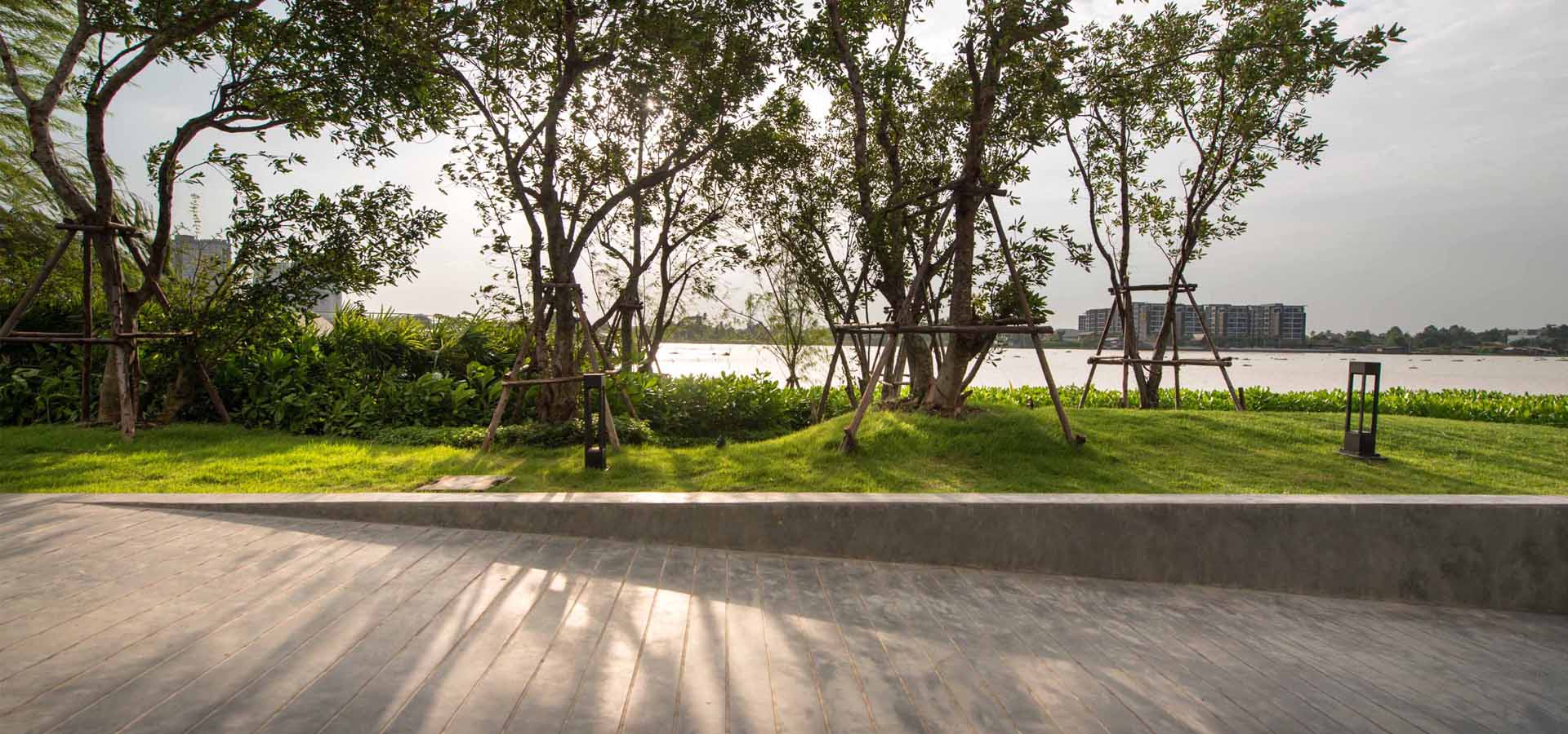 ทางเดินคอนกรีตริมน้ำ ลดระดับลงต่ำกว่าพื้นที่สีเขียวริมเขื่อน เพื่อลดการไหลของน้ำจากพื้นที่ดาดแข็งในโครงการสู่แม่น้ำ และออกแบบให้เกิดลวดลายโดยการใช้หญ้าเพื่อให้น้ำที่ไหลจากน้ำฝนได้ซึมลงไปในดิน พื้นที่ริมน้ำได้ถูกออกแบบเพื่อให้ผู้อาศัยได้สัมผัสถึงลมไอเย็นจากแม่น้ำและดื่มด่ำไปกับทัศนียภาพอันงดงามยามพระอาทิตย์อัสดง