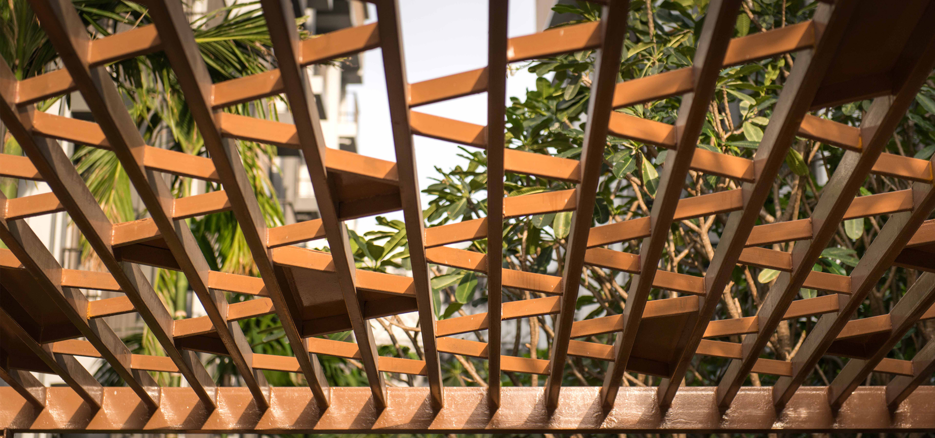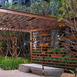 The highlight of the green space is the infinity pool that is raised up to create extensive breath-taking view of the river. The sound of water overflowing offers the sense of relaxation and also act as water feature wall, welcoming the residents to riverfront zone. One special feature of the swimming pool is the rows of Plumeria fragipani. The trees celebrate the space with unique form of multi-trunk, from the edge leaning in over the pool forming a frame vision toward the river. The trees also provide shade and the sense of soothing from the aromatic odor of their flowers.