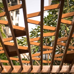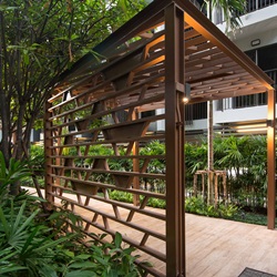 The welcome area connects to the narrow path that is purposed to be the serene Politan garden walk featuring a series of decorated pavilion that form the frame leading visitor’s vista to the river. The resting seats at the pavilions offer a tranquil and immersive ambience for private relaxation. The designers strategically capture a spectacular scene created when sunshine reflects on the river showing a dynamic glittering effect which inspires a unique pattern of decorated pavilion. The tilted angle of the pavilion illustrates lively, dynamic line that create an intriguing garden walking experience. Using layers of tropical vegetation, the designers highlight the pavilion and narrow space, as well as create privacy for the rooms on the ground floor.
