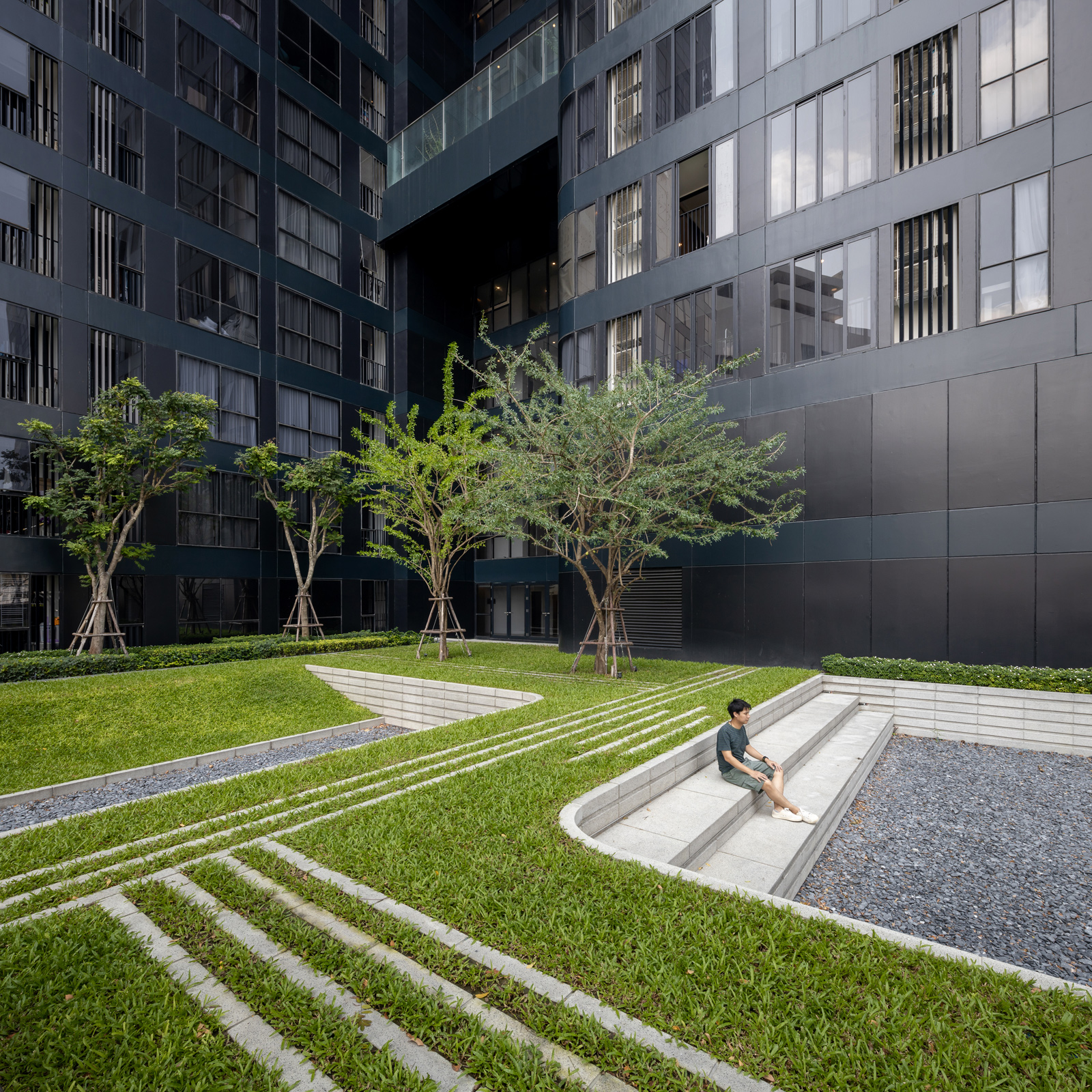 เมื่อเดินเข้าสู่ภายในโครงการ จะพบกับพื้นที่คอร์ทอยู่ด้านหลังกำแพง ซึ่งเป็นพื้นที่สีเขียวหลักที่เราต้องการเก็บไว้ให้มีขนาดใหญ่ที่สุด โดยพื้นที่คอร์ทจะถูกกดระดับลง เพื่อเพิ่มความเป็นส่วนตัว และทำให้รู้สึกว่าพื้นที่มีความกว้างขวางมากขึ้น รวมทั้งเพิ่มพื้นที่ผิวของพื้นที่สีเขียว นอกจากนี้ ระดับที่ถูกกดลงยังเป็นประโยชน์ในการเก็บกักชะลอน้ำฝนภายในโครงการ
