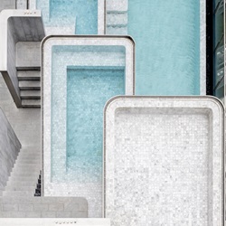 สระว่ายน้ำตั้งอยู่ที่ชั้นบนสุดของอาคาร ซึ่งมีทัศนียภาพที่สวยงาม มีการออกแบบสระว่ายน้ำ สระเด็ก และบ่อจากุชชี่ให้อยู่ระดับที่ต่างกัน เพื่อให้ทุกสระสามารถมองเห็นวิวได้เท่าเทียมกันทั้งหมด โดยไม่มีการบดบังสายตากัน