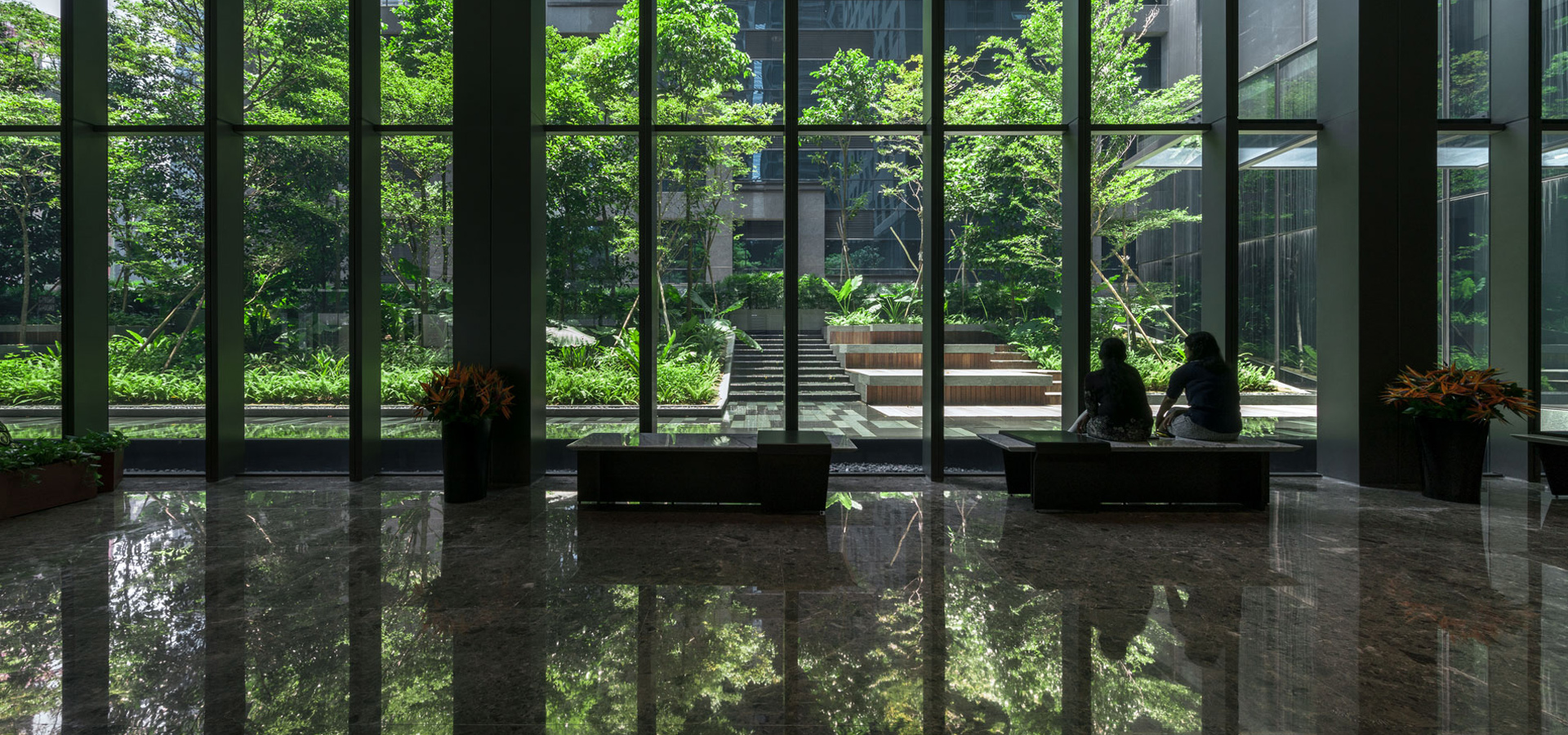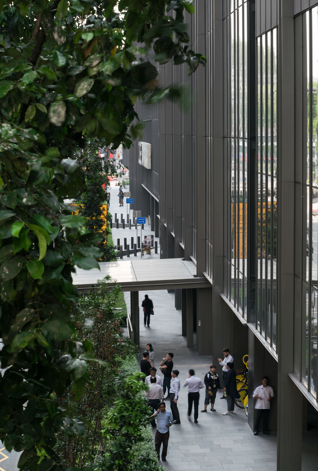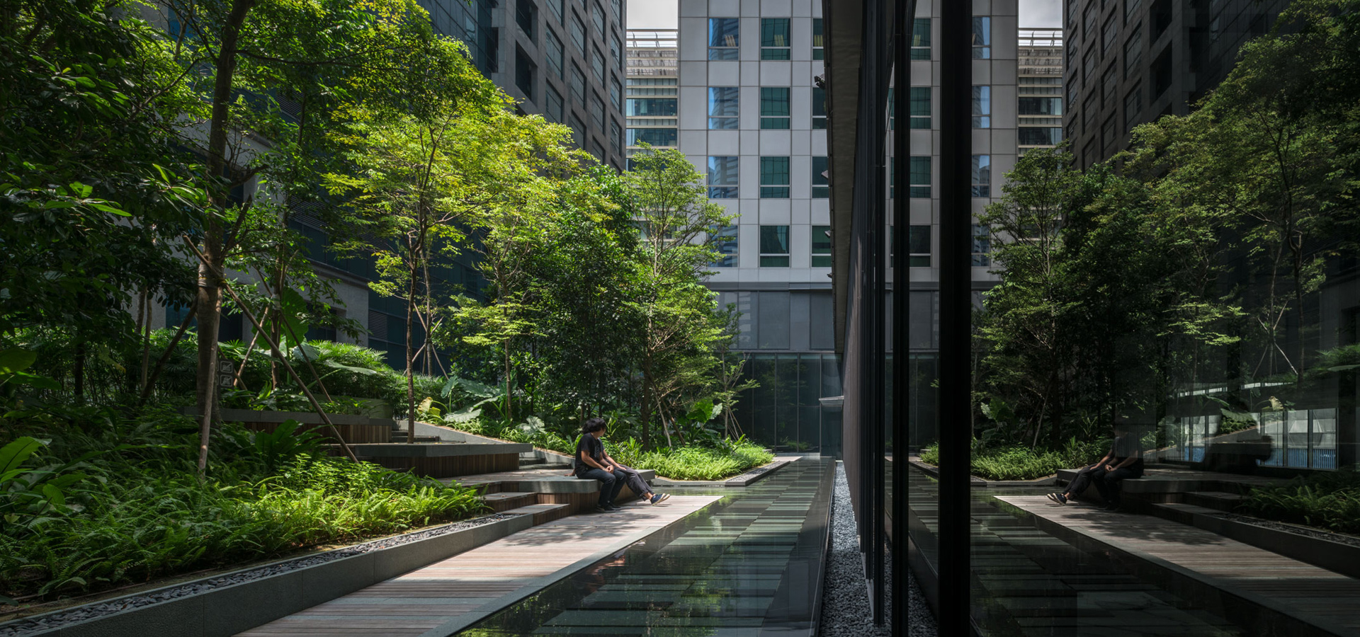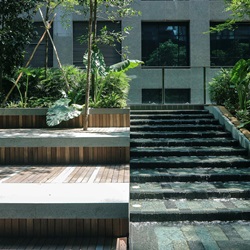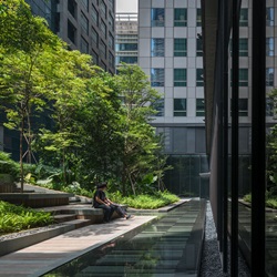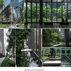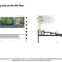 ส่วน Outdoor seating area ตั้งอยู่ระหว่างทางเชื่อม Office Lobby กับ Commercial area ช่วย screen อาคารด้านหลังที่ไม่สวยงามด้วยการใช้เนินดินรับกับสายตาผู้สัญจรไปมาภายใน corridor ผสมกับการปลูกป่า ใช้ชนิดพืชพรรณที่หลากหลายทั้งลักษณะ ขนาด และสีสัน เพื่อเชื้อเชิญให้ออกไปนั่งบริเวณ step seating ที่จัดเตรียมไว้ท่ามกลางป่าในเมือง นอกจากนั้นยังออกแบบสร้าง feature น้ำตกล้อกับ form ของเนินดิน เพื่อสร้างความร่มรื่นด้วยเสียง ประกอบกับร่มเงาของต้นไม้ป่าหลากหลายชนิด วัสดุธรรมชาติเพื่อลดความร้อนจาก heat island ทำให้เกิด micro climate ที่สบาย สามารถออกไปใช้งานได้ตลอดวัน