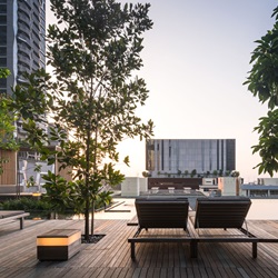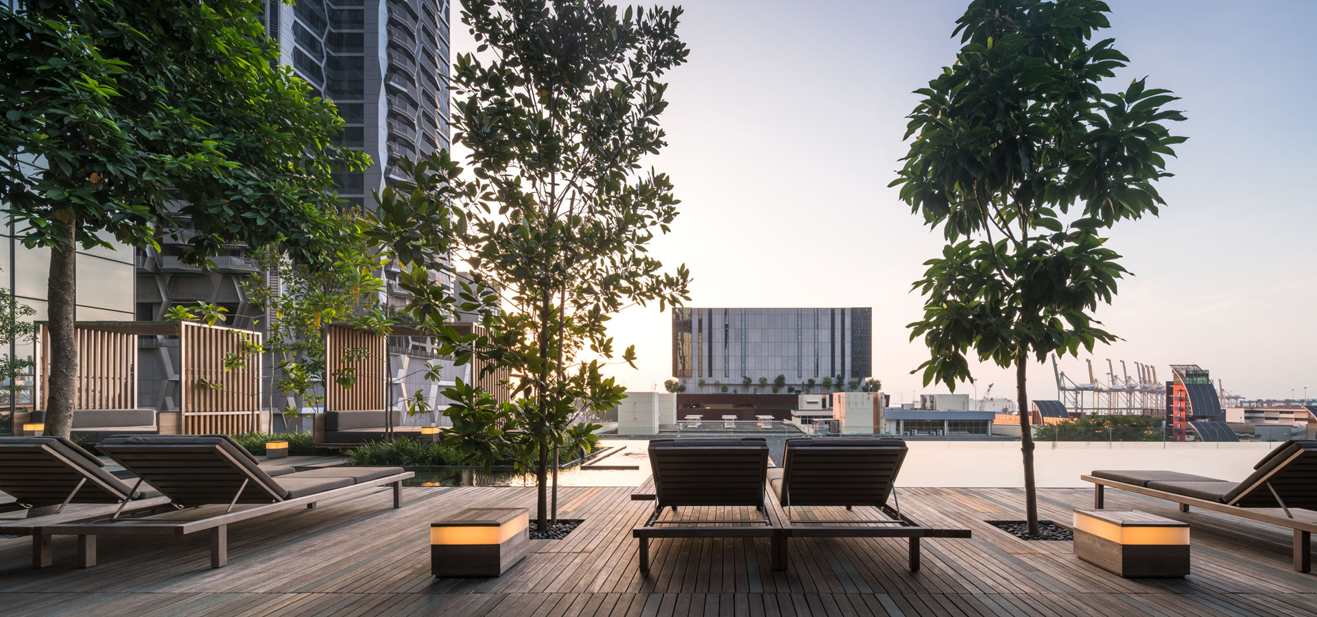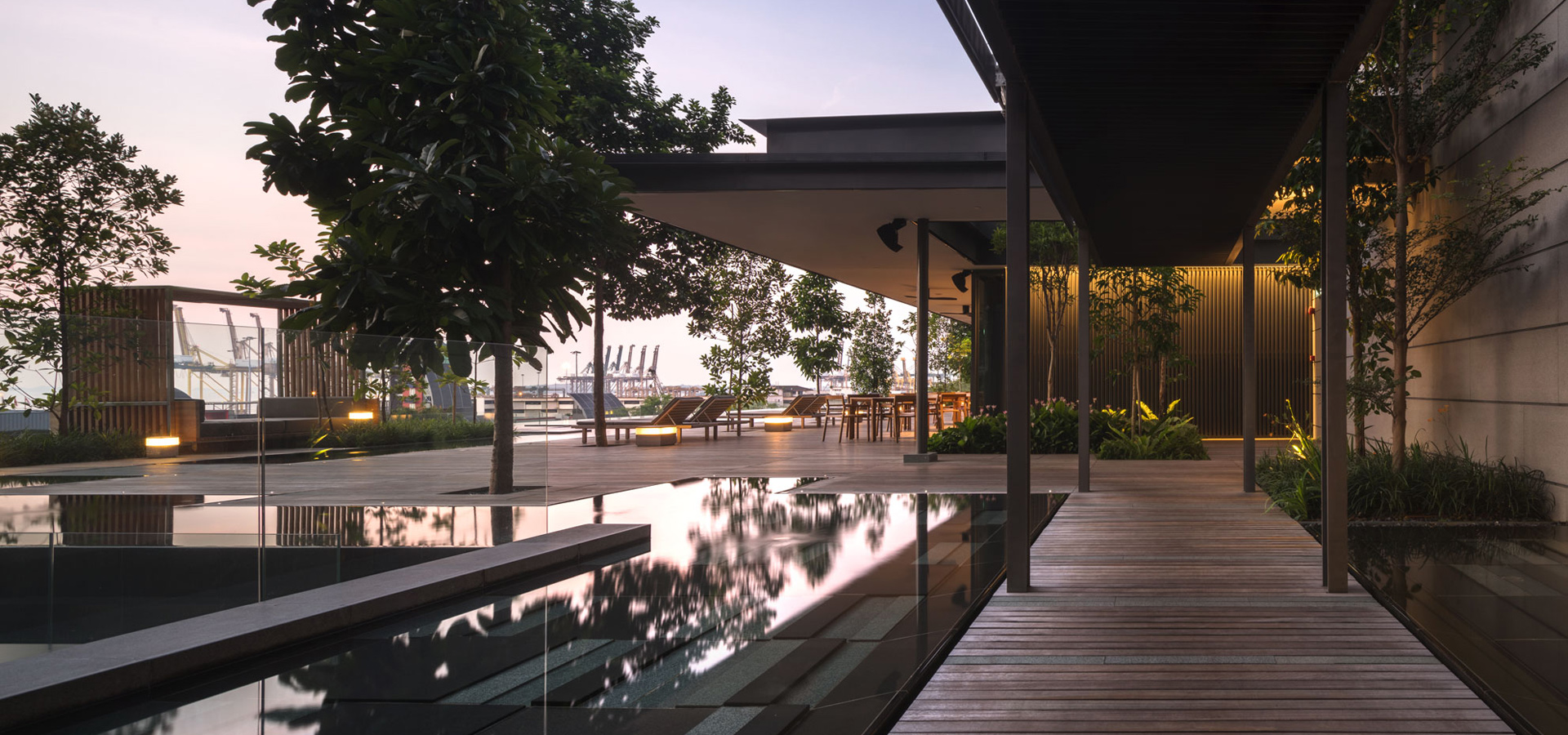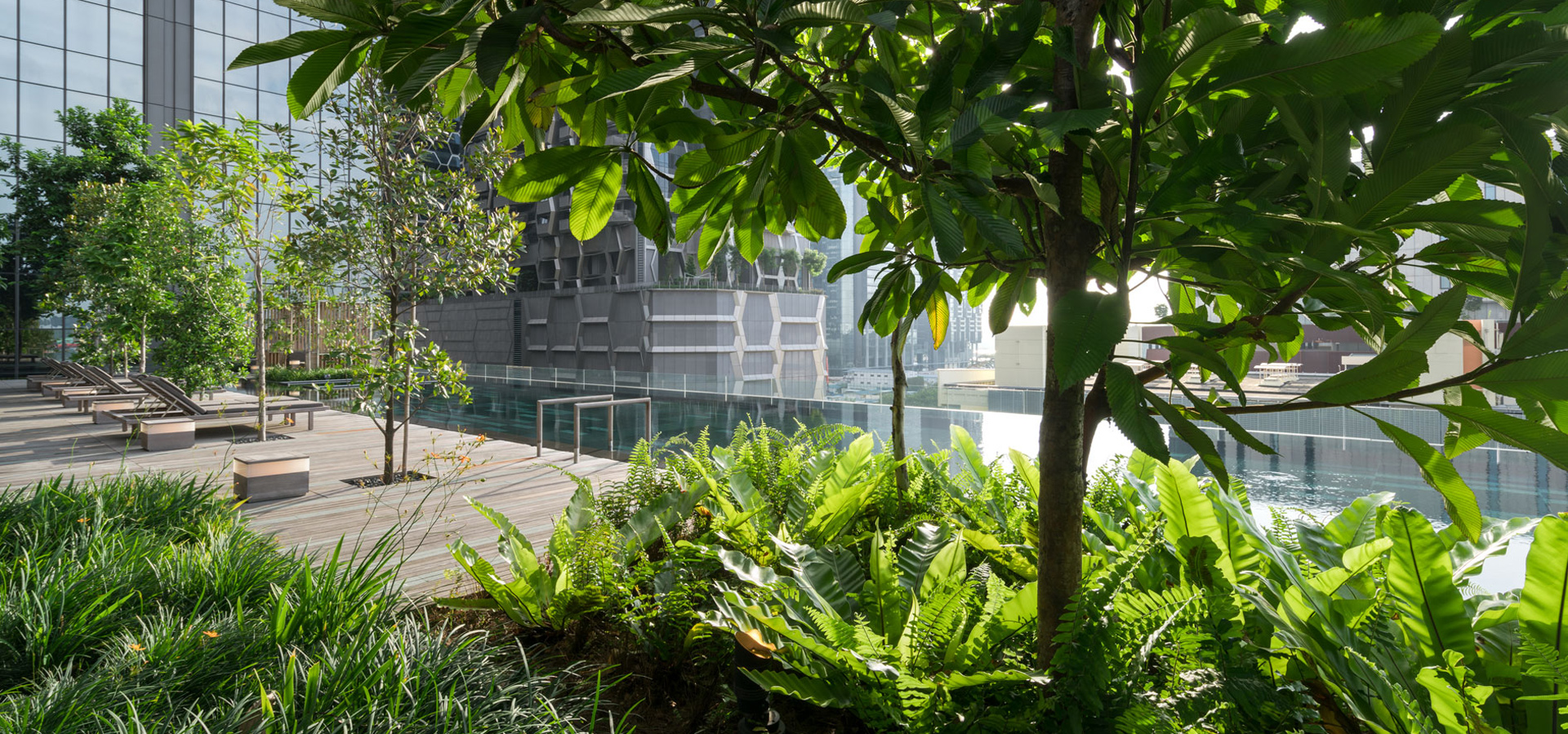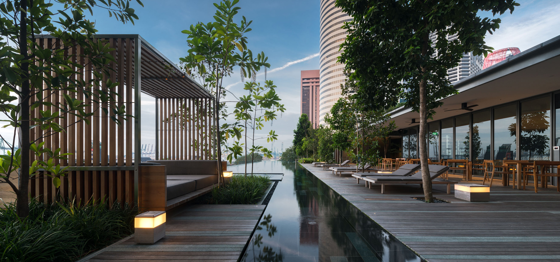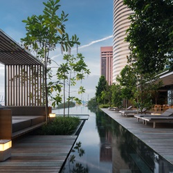 สระว่ายน้ำ infinity edge ที่สามารถ enjoy วิวทะเลได้พร้อมกับบรรยากาศพระอาทิตย์ตก ออกแบบให้มีความร่มรื่นด้วยไม้ป่าหลากหลายชนิด ผสานกับเส้นสาย hardscape ที่มีความเนี๊ยบ คม Modern ของ water feature edge กับ timber deck ที่ interlock กันอย่างลงตัว ทำให้มี character ที่พิเศษ สามารถออกมาพักผ่อนได้ตลอดทั้งวันบน pool deck หรือ Cabana ที่ออกแบบมาพิเศษสำหรับที่นี่โดยเฉพาะ ให้สามารถมองวิวเมืองย่าน Shenton way หรือวิวทะเลได้อย่างเต็มที่ ส่วนฟิตเนส, outdoor shower และ breakfast lounge ในบริเวณเดียวกัน ก็ถูกออกแบบมาให้ถูกห้อมล้อมด้วยธรรมชาติที่อุดมสมบูรณ์ไปด้วยพรรณไม้ป่านานาชนิด ให้ความเขียวชอุ่มและร่มรื่นด้วยหลักการสร้าง micro climate เช่นเดียวกันกับพื้นที่ชั้น 4