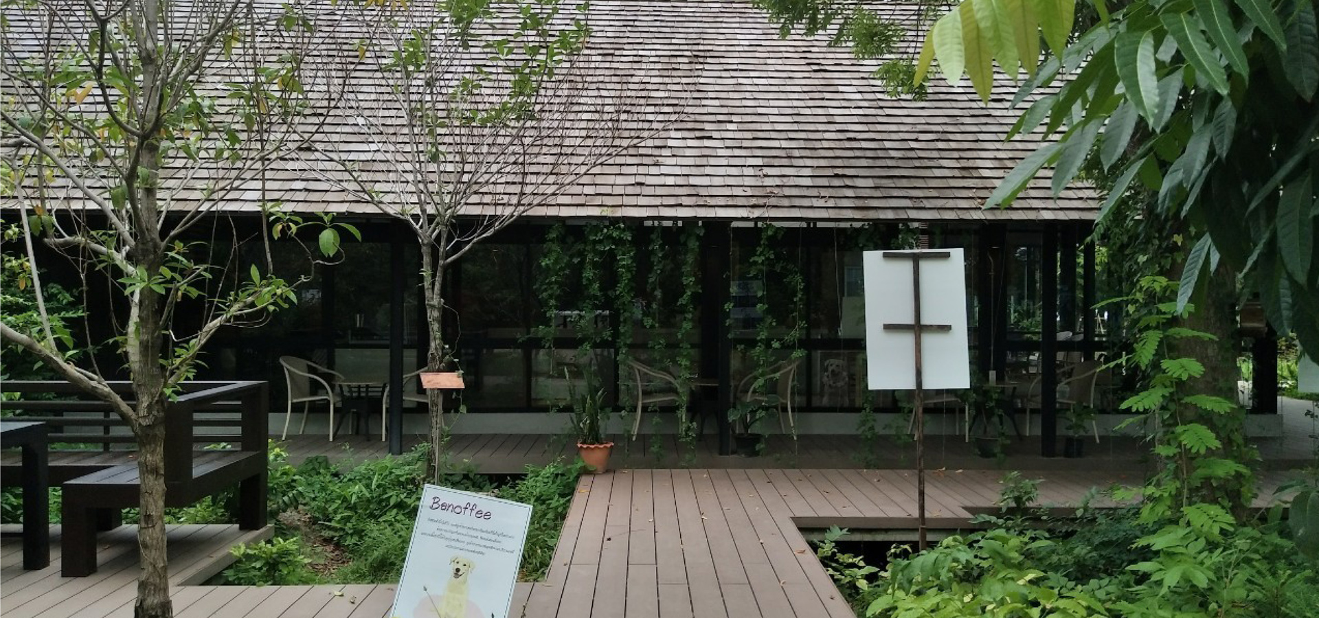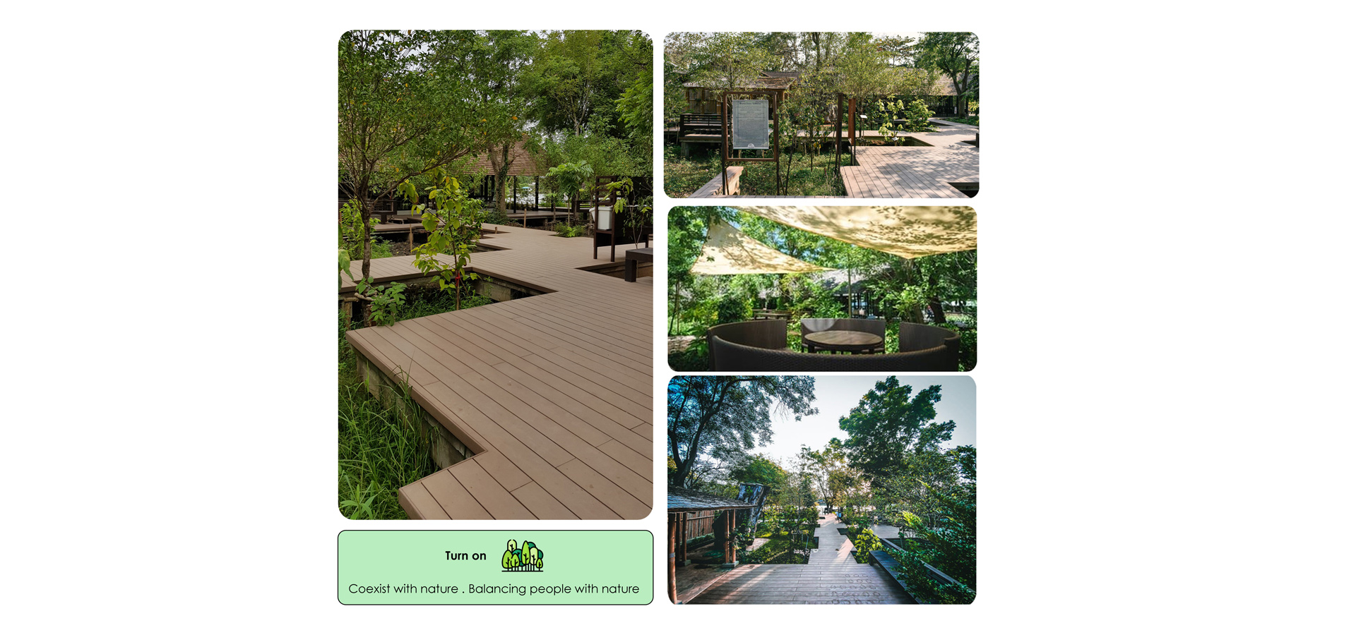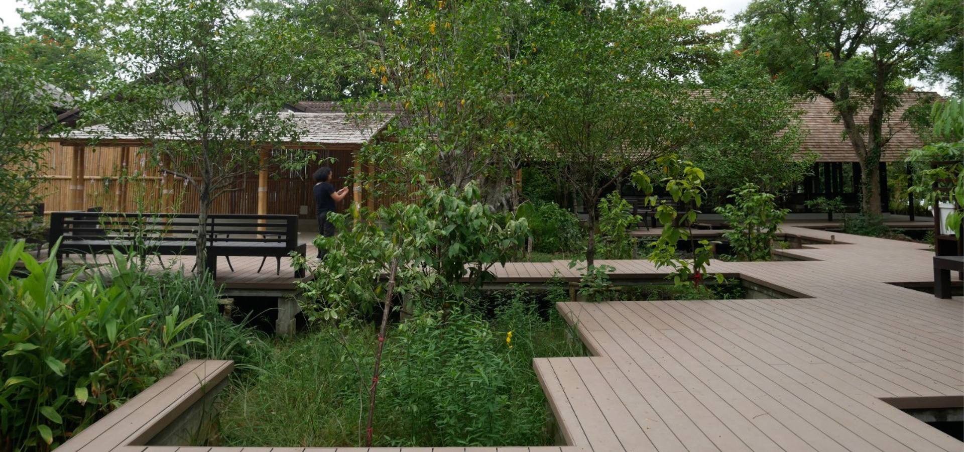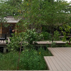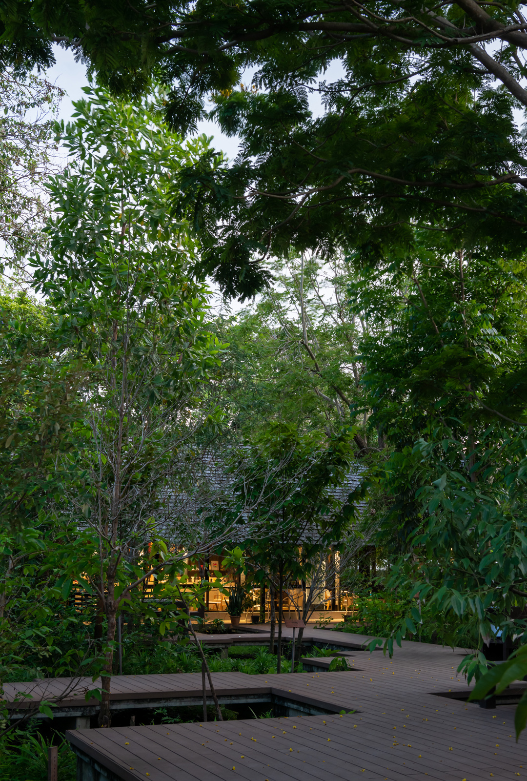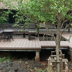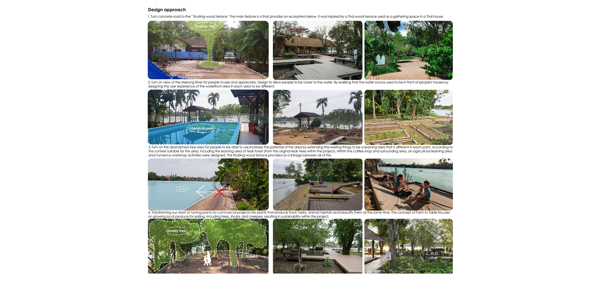 Increase the potential of the area by extending the existing things to be a learning area that is different in each point. According to the context suitable for the area, including the learning area of teak forest (from the original teak trees within the project). Within the coffee shop and surrounding area, an agricultural learning area and numerous workshop activities were designed. The floating wood terrace provided as a linkage between all of this.4.Transforming our vision of turning plants for commercial projects into plants that produce food, herbs, animal habitats and beautify them at the same time. The concept of Farm to Table focuses on growing local produce for eating, including trees, shrubs, and creepers, resulting in sustainability within the project.