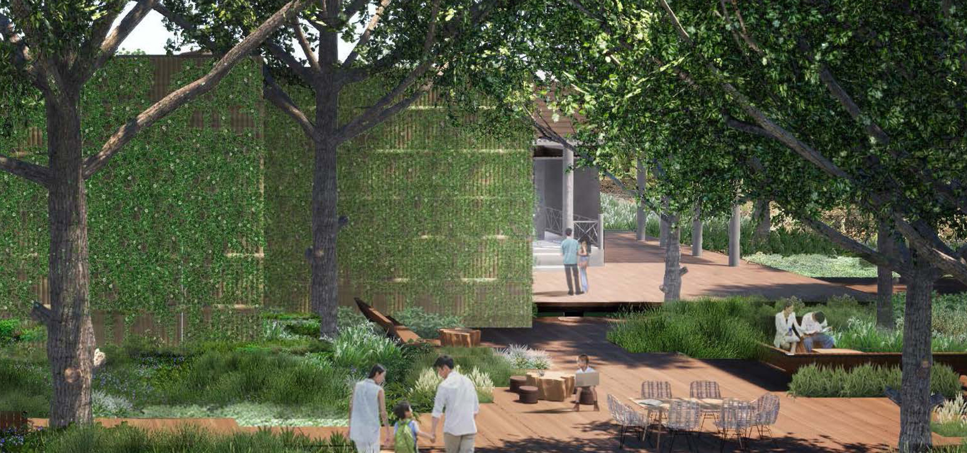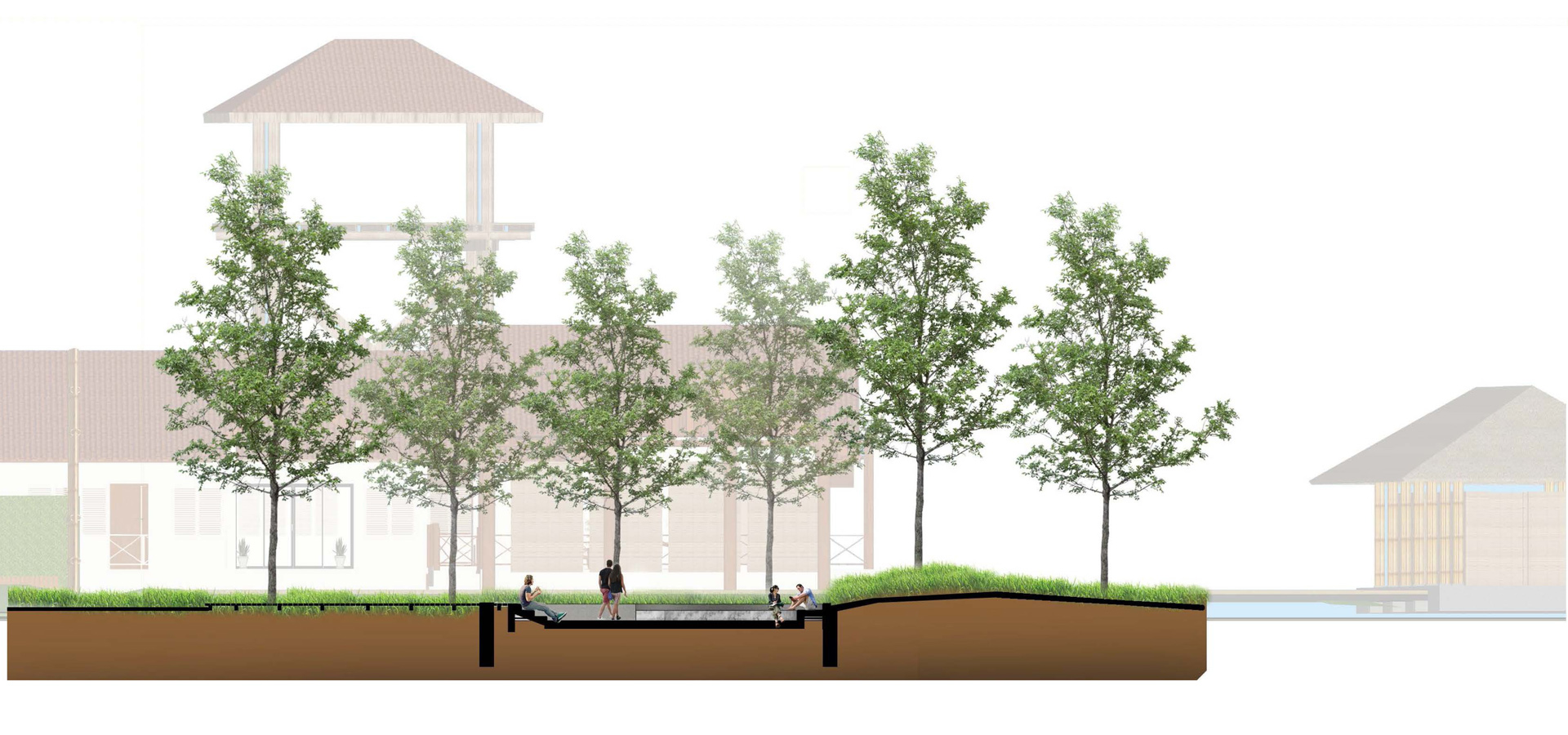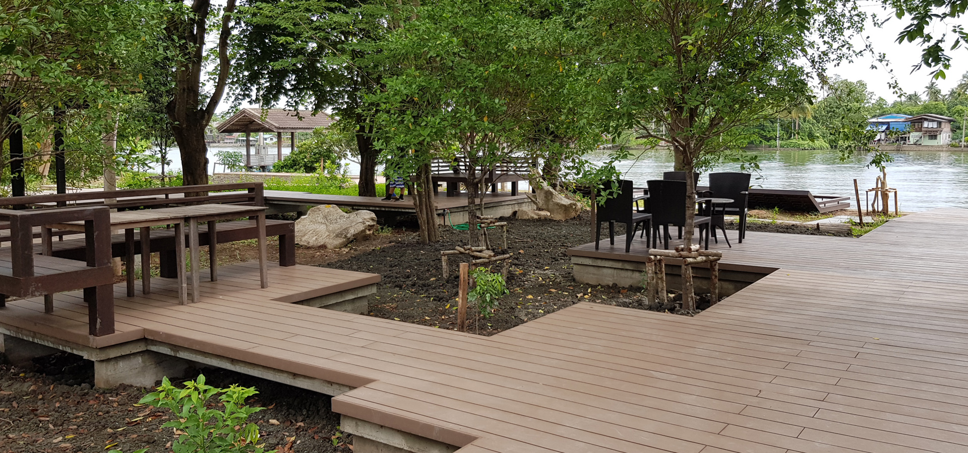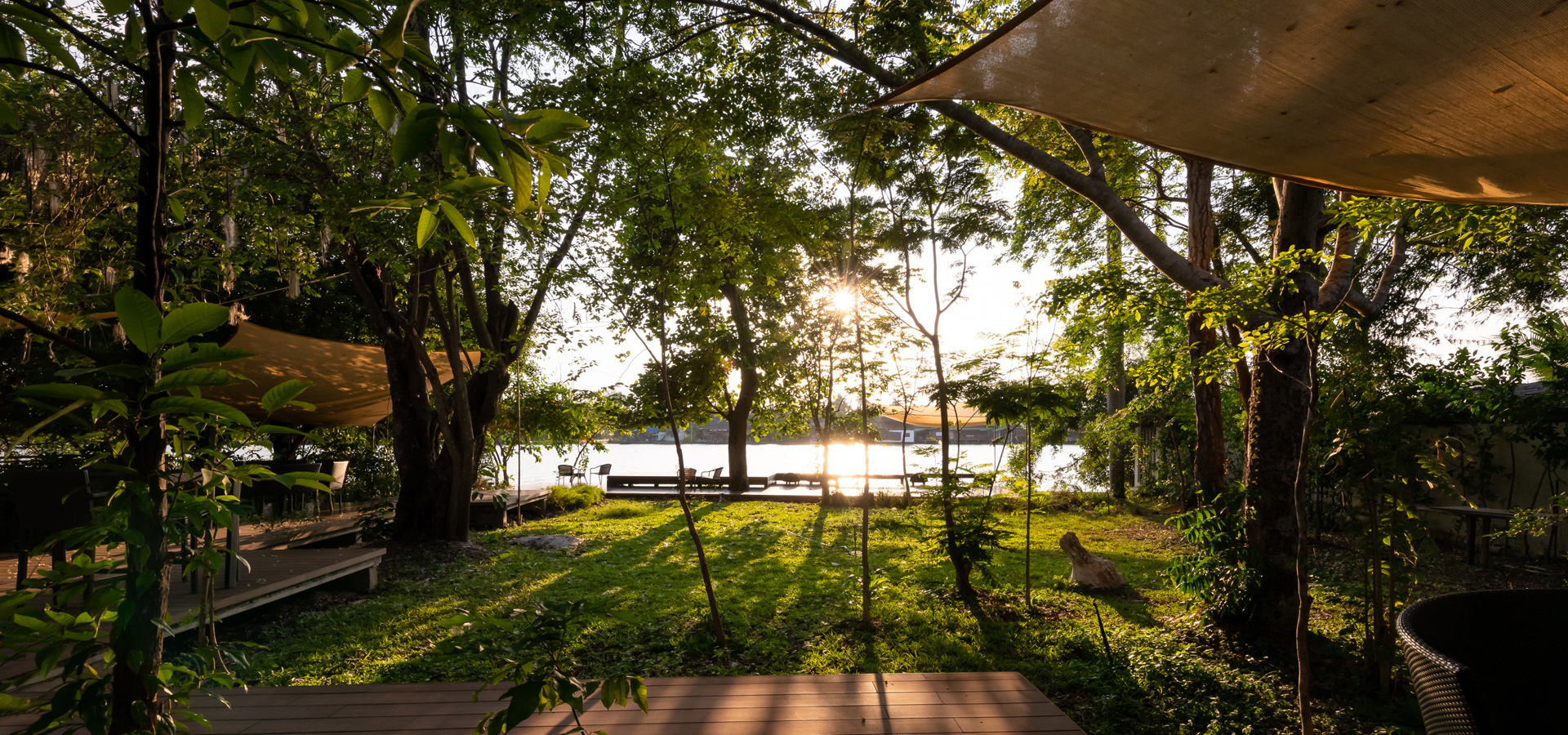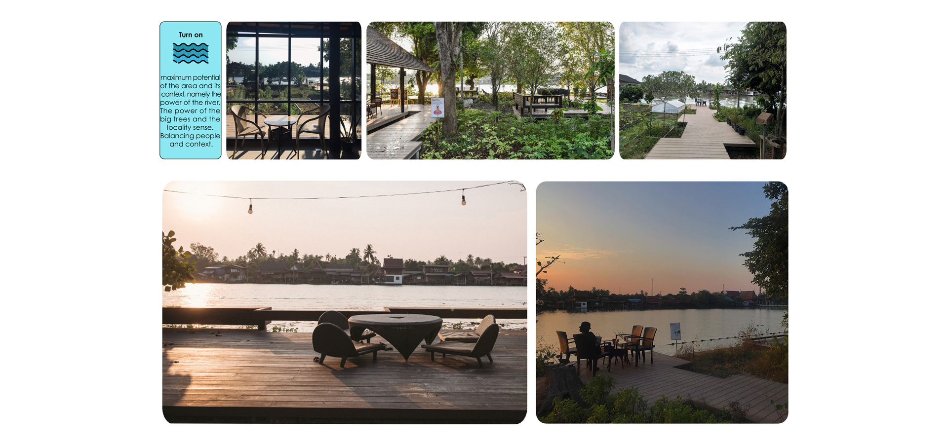 maximum potential of the area and its context, namely the power of the river. The power of the big trees and the locality sense. Balancing people and context