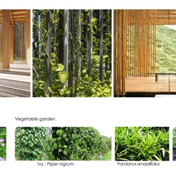 2. แนวคิดเรื่อง Farm to table เน้นการปลูกพืชผลผลิตพื้นบ้านเพื่อรับประทาน ทั้งไม้ต้น ไม้พุ่ม และไม้เลื้อย ทำให้เกิดความยั่งยืนภายในโครงการ รวมทั้งพืชที่ปลูกนั้น ยังเป็นพืชสมุนไพร ที่มีความสวยงาม