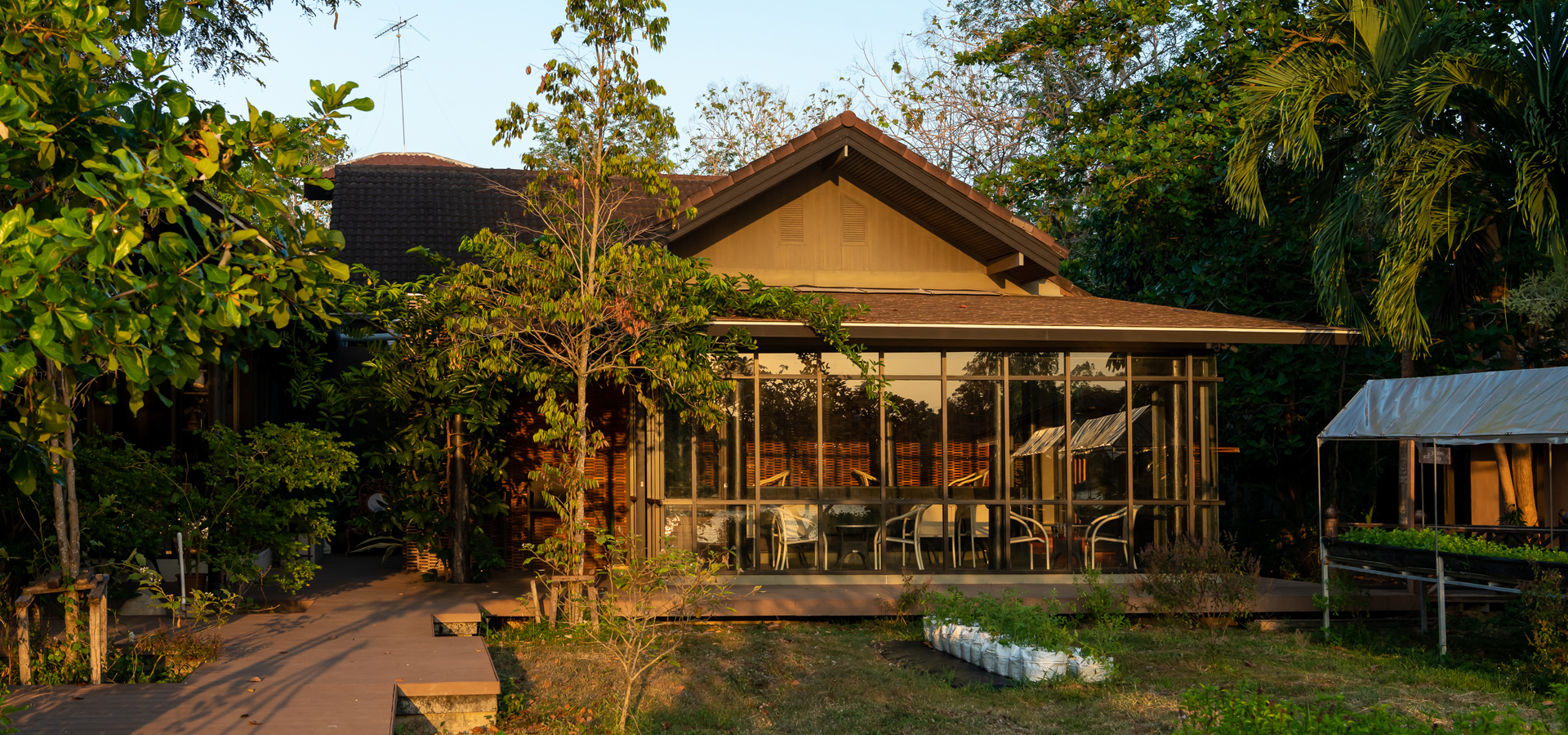 It was originally a garden house which was not in use. The project owner has an idea to develop this area to be a coffee shop project and agricultural learning base on an existing in this site. This house aims to live a healthy and balanced. City life and nature in the middle through organic farming “agroforestry” “Grow what you eat” “Eat what you grow” are conveyed in terms of services, food, beverages, bakery, processed products in the cafe zone. Learning through practical education in various workshop activities and convey the way of life, the body of knowledge of agroforestry to see the results we call "Sustainable happiness". There are also makes the way of life along the Mae Klong River of Thai people in the past come back again. Until there is an area where everyone can come out and use it happily.
