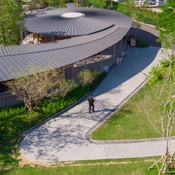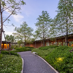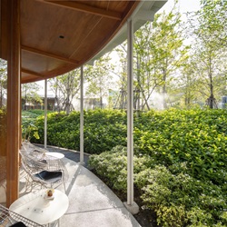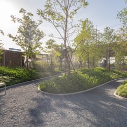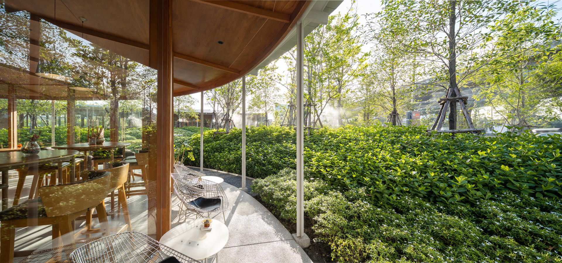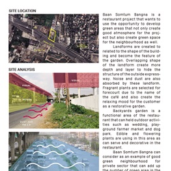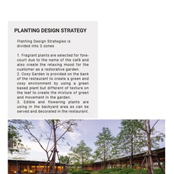 Landforms are created to related to the shape of the building and become the feature of the garden. Overlapping shape of the landform create more depth and layer to hide the structure of the outside expressway. Noise and dust are also absorbed by these landform. Fragrant plants are selected for forecourt due to the name of the café and also create the relaxing mood for the customer as a restorative garden.