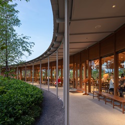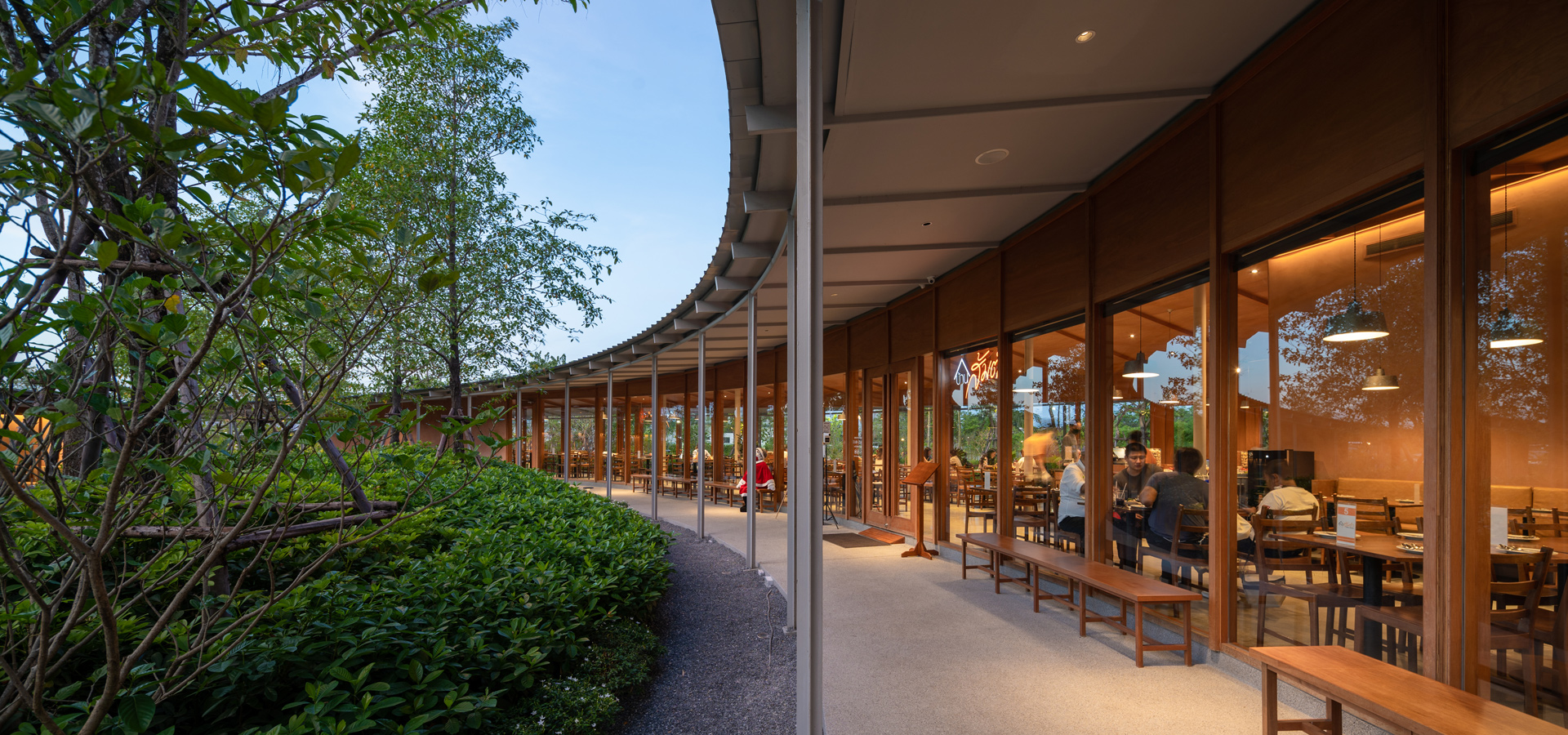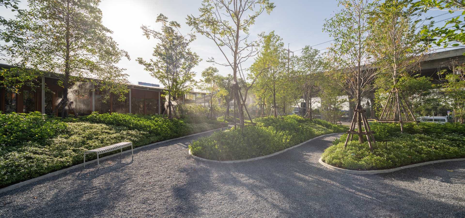 สวนด้านหน้า ออกแบบให้มี Landform สอดคล้องกับอาคาร เพื่อเป็นจุดหยุดสายตาจากคนด้านในร้านอาหารเพื่อบดบังโครงสร้างทางด่วนขนาดใหญ่ และเอาไว้ใช้สำหรับการกรองฝุ่นละอองและเสียง